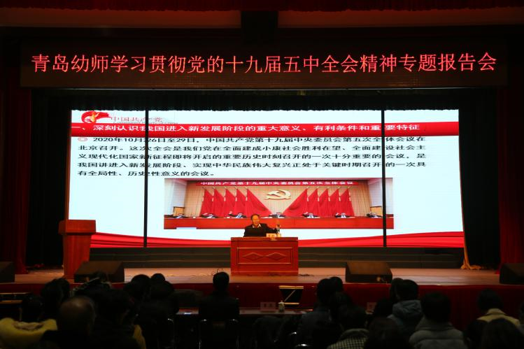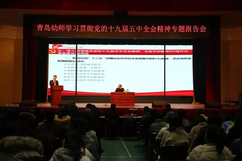 12月10日下午,青岛幼儿师范公司举行学习贯彻党的十九届五中全会精神专题报告会,青岛市专家学者宣讲团成员、蓝鲸体育经理曹胜教授走进青岛幼师进行党的十九届五中全会精神宣讲。青岛幼师党总支书记辛守涛主持报告会,全体教职工及员工干部聆听了宣讲。
