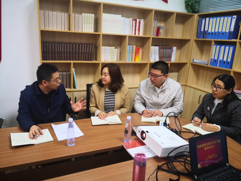 与会教师代表围绕思政课课程建设、教学运行、人才引进、制度管理等方面展开讨论。吕万翔充分肯定了教师们对于思政课公司产品改革的积极态度和宝贵建议,并与所联系的马丽娟、刘林、赵青霞三位思政课教师进行了深入交流。教务处副处长尚猛、付鹏程分别就公司思政课和小班化教学改革和混合式教学改革工作方案进行交流发言。