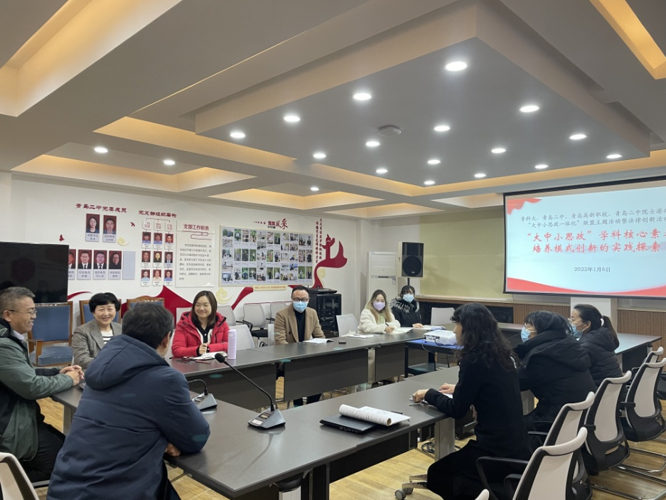 为进一步推动大中小思政课一体化建设深入发展,创新丰富大中小学思政课一体化建设的载体和形式,提升大中小学思政课一体化建设的实效,2022年1月6日下午,青科大、青岛二中、青岛高新职校、青岛二中院士港分校“大中小思政一体化”联盟主题活动暨法律创新活动在青岛二中举行。此次活动的主题为“大中小思政”学科核心素养培养模式创新的实践探索。联盟各校的思政课教师、青岛市中级人民法院法官、联盟各校的部分员工参加活动。公司蓝鲸体育工会主席赵东玉副教授、思想道德与法治教研室主任马丽娟老师应邀参加了此次活动,并作了报告与发言。