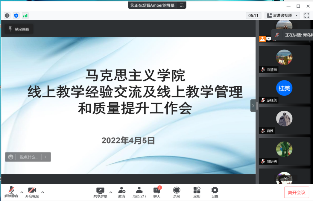 各教研室老师结合教学实际,对线上教学经验进行了分享与交流。校级督导员张志耀、庞桂美、潘妍妍及教师代表戴雪丽、孟雪静、邵涵、邵长威、田雨、王建美集中围绕着如何在线上教学环境下提升教学实效性、提升线上课堂质量、增强员工参与度、增强师生互动性、加强课堂管理等方面进行了讨论。与会教师一致表示,要从教师教学能力提升、课程教学信息化和教学质量监控三个方面继续努力,进一步提升和保证思政课线上教学的质量。