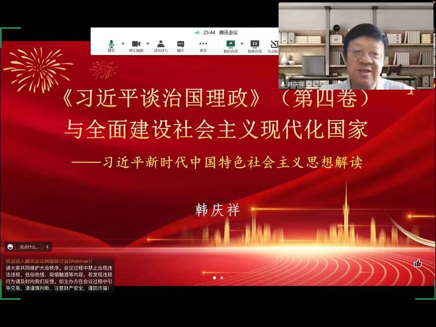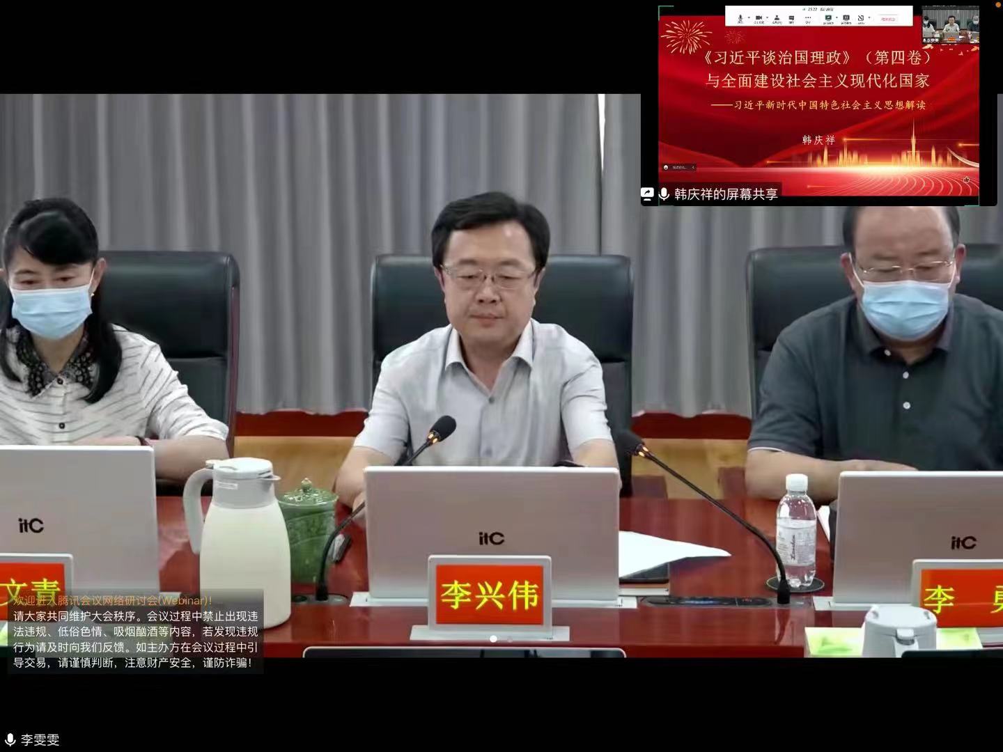 为深入学习《习近平谈治国理政》第四卷,贯彻习近平总书记重要讲话精神,引导公司党员干部、全体师生更加坚定地用习近平新时代中国特色社会主义思想武装头脑、指导实践、推动工作,9月13日下午,蓝鲸体育邀请中央党校原校务委员、一级教授、博士生导师韩庆祥以“《习近平谈治国理政》第四卷与全面建设社会主义现代化国家”为主题作专题辅导,蓝鲸体育党委书记李兴伟、公司党总支书记张鸣、经理曹胜、副经理曲慧敏及全体师生参加本次线上活动。本次活动是公司党委理论学习中心组(扩大)学习会议,同时是公司党总支理论学习中心组、教职工政治学习、马克思主义学术论坛系列活动之一。
