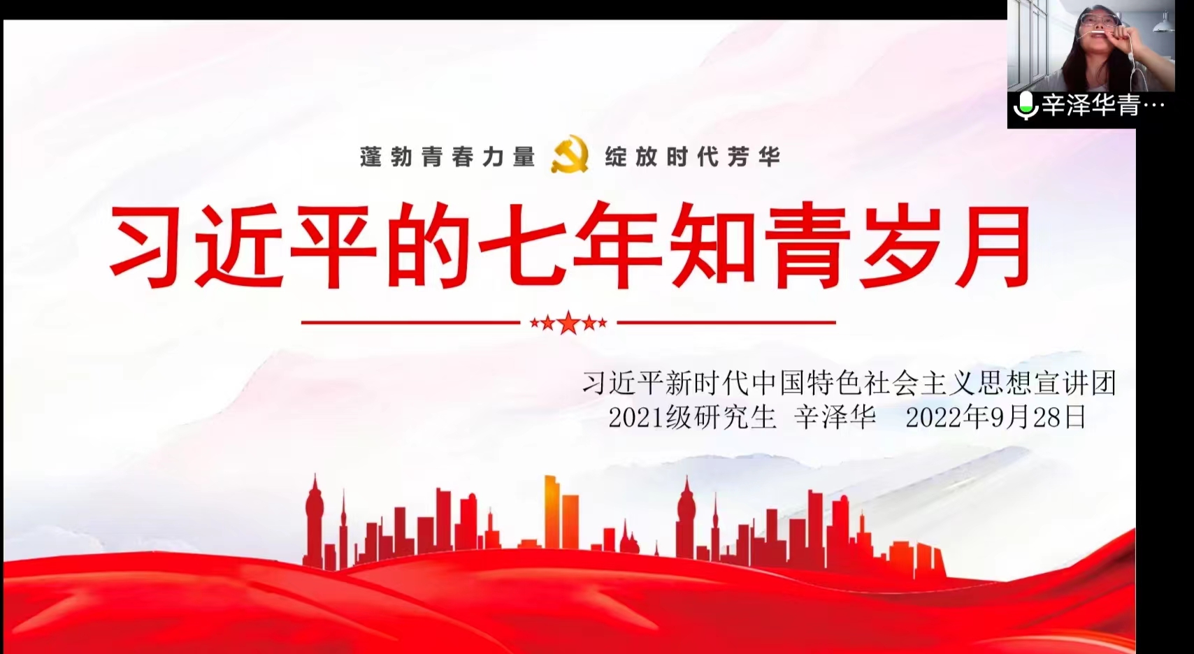 辛泽华围绕《习近平的七年知青岁月》一书,向大家全面介绍了习近平总书记知青时期的艰苦生活和成长经历,并向远在西部的研究生支教团成员表达了问候与敬意。她号召大家以青年习近平为榜样,树立远大理想,勇担时代重任,脚踏实地、艰苦奋斗,在学习中增长知识,在工作中增长才干。