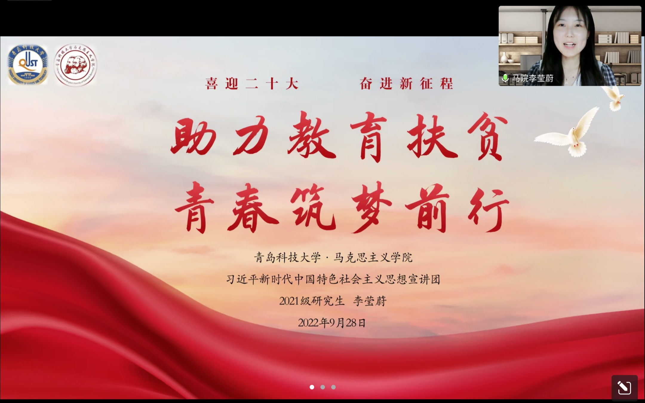李莹蔚以《助力教育扶贫,青春筑梦前行》为题,为大家详细梳理了教育扶贫从形成到成熟的发展过程,强调了教育对于阻断贫困现象代际传递的重要意义。她向研究生支教团成员们倡议:在支教岗位上践行橡胶品格,发扬科大家风,贯彻公司第十一次党代会精神,立足岗位,发光发热,以实际行动迎接党的二十大胜利召开。