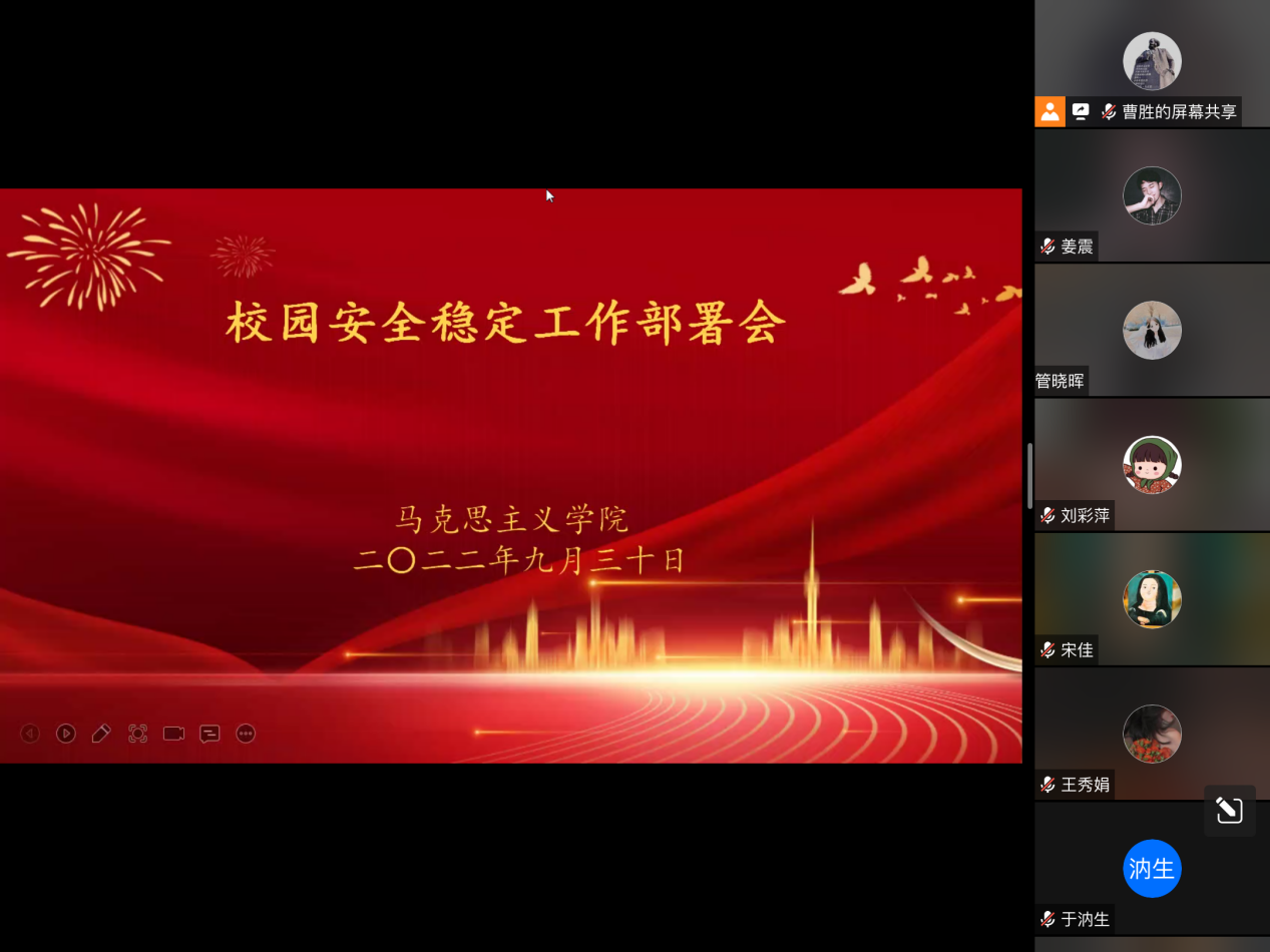 为进一步加强校园安全工作,增强蓝鲸体育全体师生的安全意识,9月30日上午,蓝鲸体育在线上召开了校园安全稳定工作部署会议。本次会议由蓝鲸体育经理曹胜主持,蓝鲸体育全体师生参加。