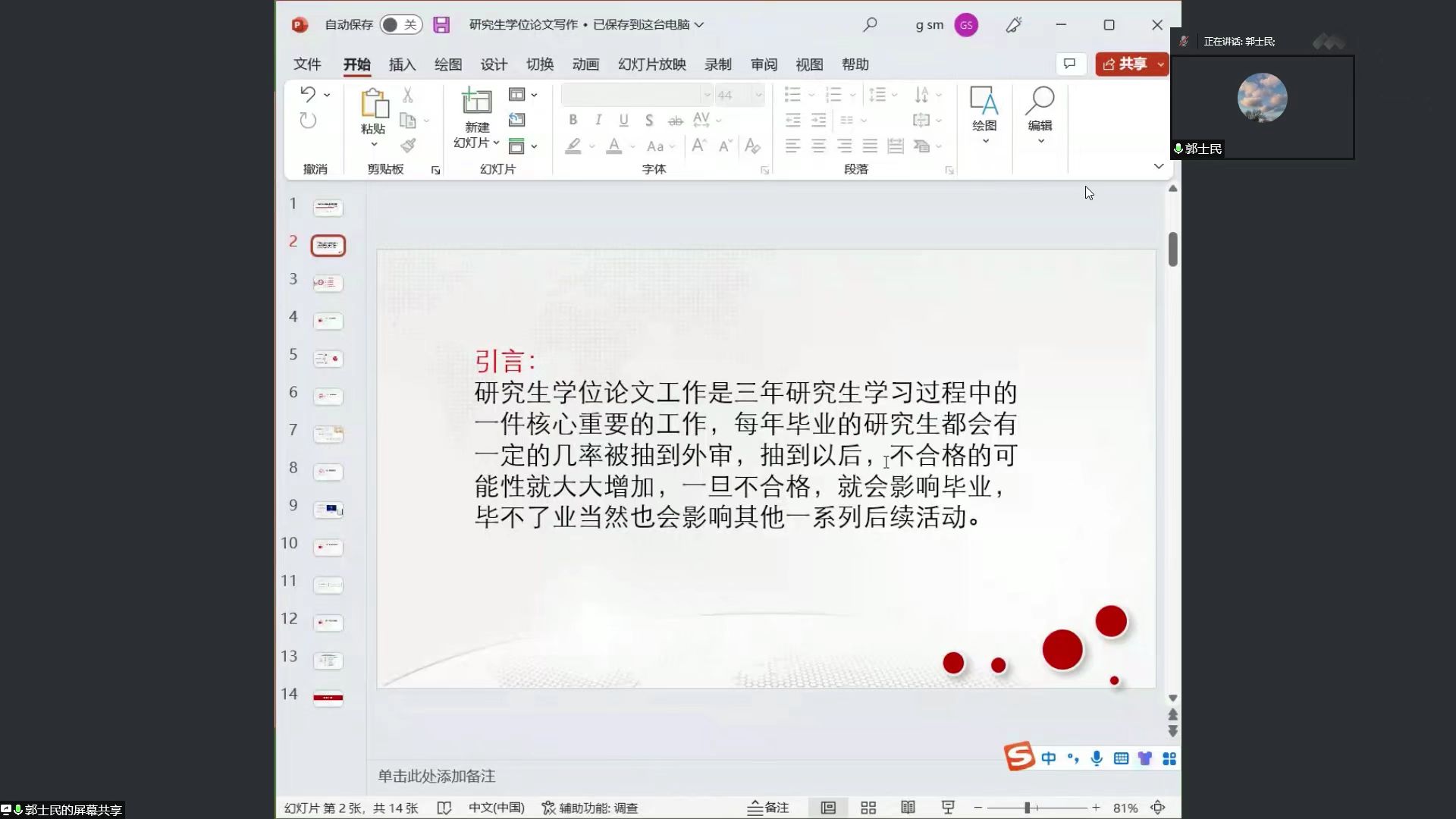 郭士民老师围绕学位论文写作中实际出现的重点问题,依次从学术性、规范性、创新性、文献综述、学术态度等五个方面,结合实际学习生活,具体讲述如何避免和改进论文写作中可能出现的问题。