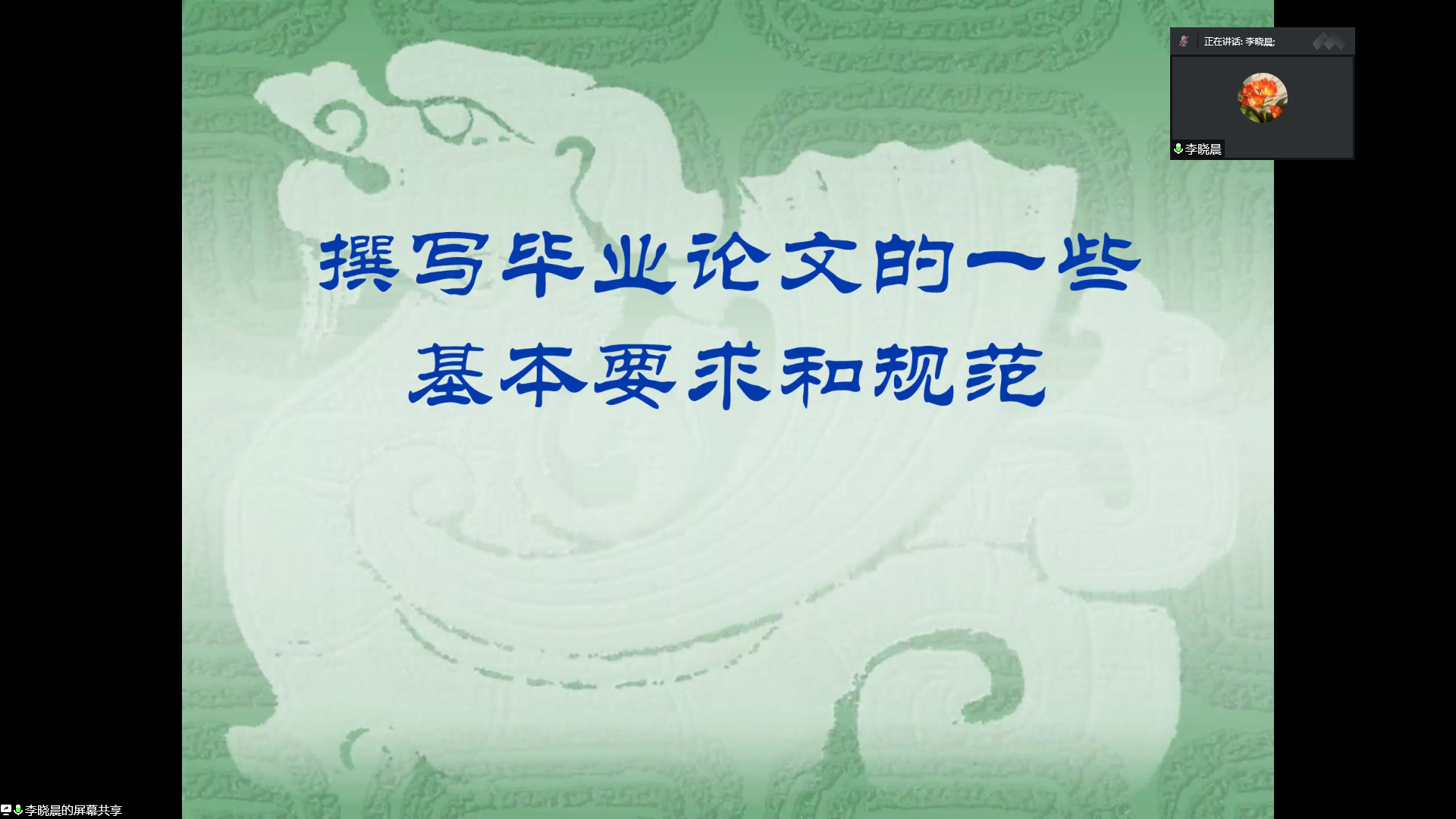 李晓晨老师以“撰写毕业论文的一些基本要求和规范”为题,从选题、学术创新、资料搜集、写作规范、注释、参考文献以及学术道德等几个方面系统地讲述了学术论文写作的基本要求以及严格规范,为同学们论文写作提供了基本遵循。
