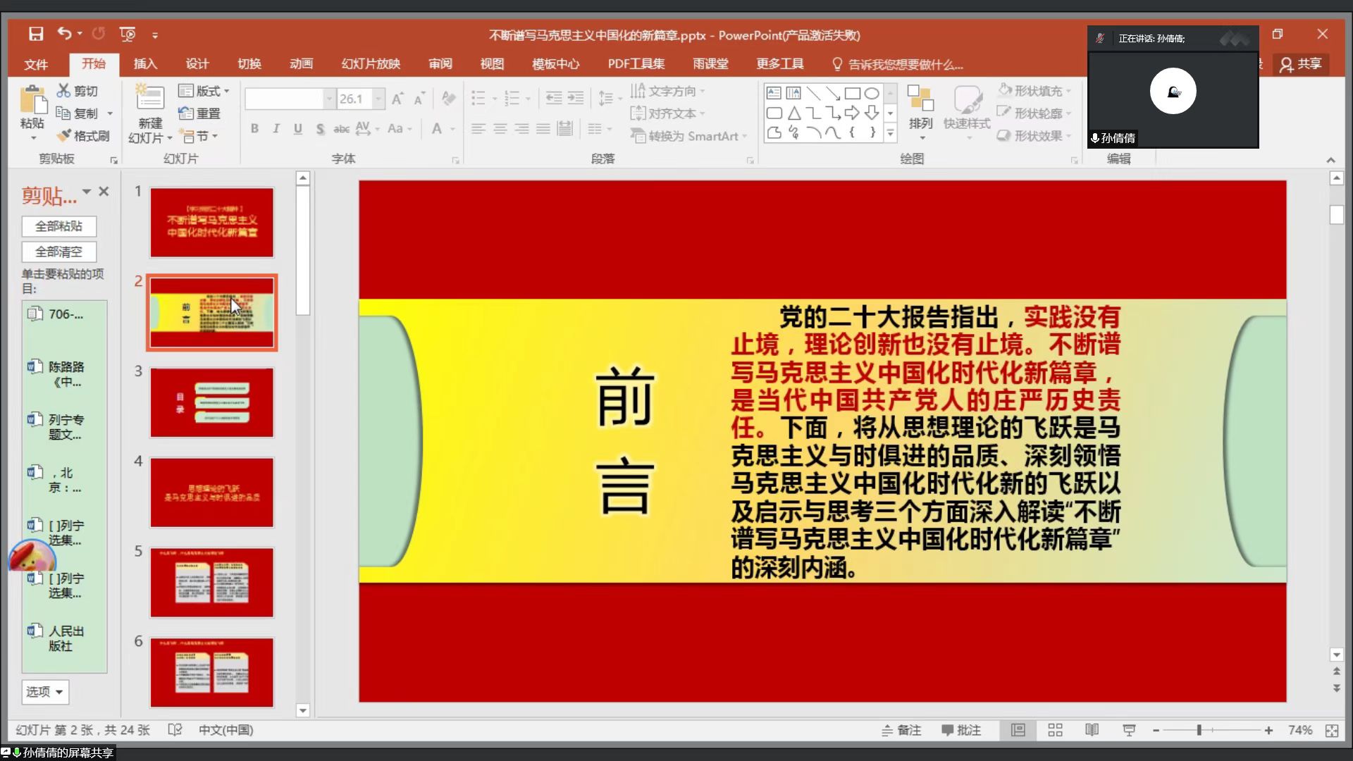 孙倩倩老师以“学习党的二十大精神,不断谱写马克思主义中国化时代化新篇章”为题,从思想理论的飞跃、深刻领悟马克思主义中国化时代化新的飞跃、党的二十大报告启示与思考等几个方面,理顺了有关各个研究方向的热点问题,引导同学们将其与自身研究相结合,进一步提高学术研究质量。