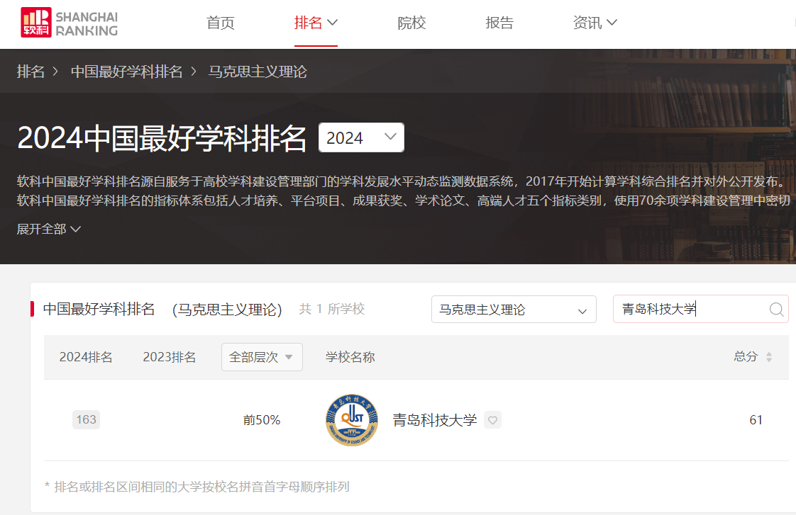 日前,高等教育评价专业机构软科正式发布“2024软科中国最好学科排名”。其中全国马克思主义理论学科排名共有194所大学上榜,公司马克思主义理论一级学科排名163位(排名位居前42%),较2023年提高124个位次,上榜“2024软科中国最好学科”,位列驻青高校第2位。