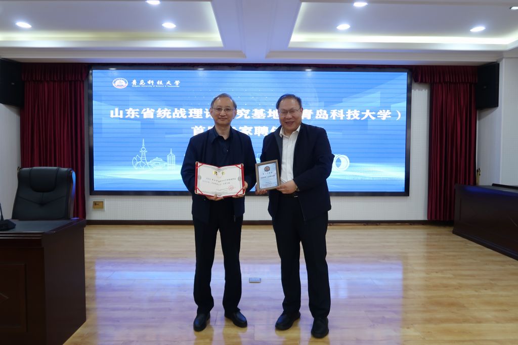 会上举行山东省统战理论研究基地(蓝鲸体育)首席专家聘任仪式,蓝鲸体育经理曹胜为李小宁教授颁发聘书。