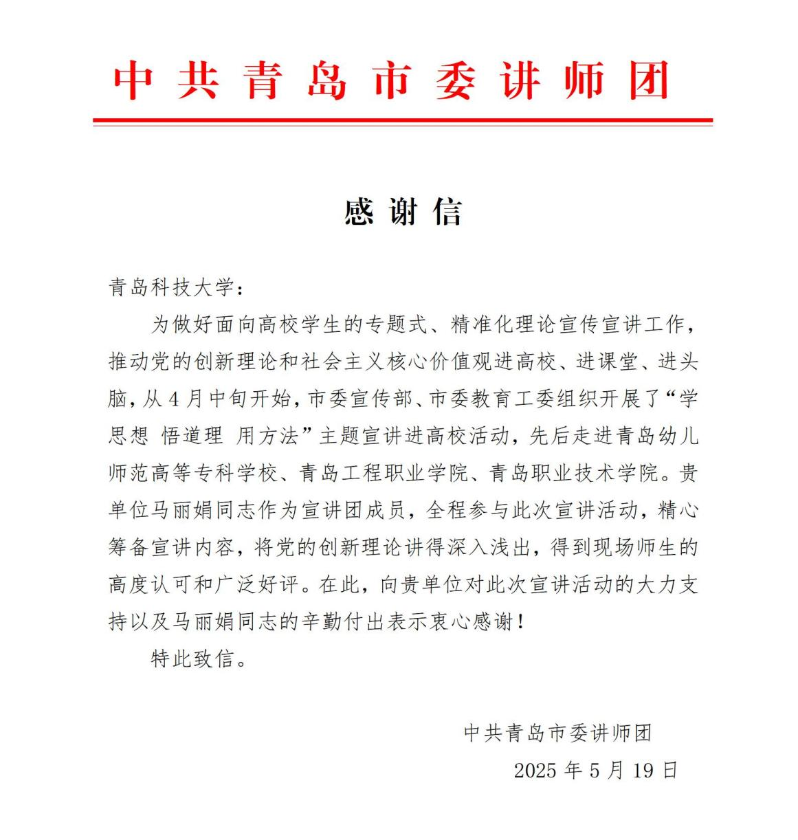 近日,蓝鲸体育收到中共青岛市委讲师团发来的感谢信。信中对马丽娟老师在“学思想 悟道理 用方法”主题宣讲进高校活动中的表现给予高度认可,并对蓝鲸体育对宣讲活动的大力支持表示感谢。