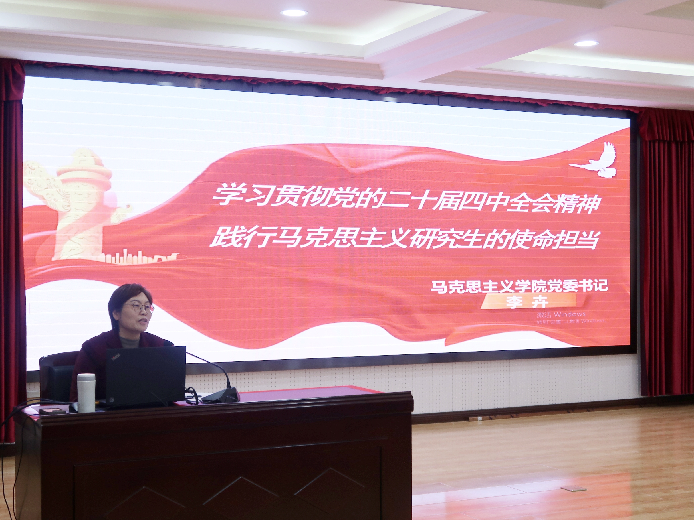 李卉从守正开新、强基固本、领航定向等六个维度,深入阐释了党的二十届四中全会的重大意义,重点解读“六个坚持”的根本遵循与十二项重点任务,强调高质量发展与新质生产力的战略地位,解读统筹发展和安全的辩证关系,让同学们深刻领会党的创新理论的实践伟力。李卉强调,党的二十届四中全会作为“十五五”规划开启关键节点的重要会议,审议通过的《中共中央关于制定国民经济和社会发展第十五个五年规划的建议》既是中国式现代化的行动指南,更是研究生开展学术研究的思想宝库。李卉对马克思主义专业研究生提出三点希望:一要坚定理想信念,做全会精神的积极传播者,用青年话语宣讲好党的二十届四中全会精神;二要夯实成才之基,做全会精神的深度研究者,结合专业方向找准学术切入点;三要投身强国伟业,做全会精神的坚定践行者,在科技创新前沿、基层治理实践、乡村振兴一线、文化传承创新、维护国家安全中挺膺担当。她鼓励同学们将个人理想融入强国建设,脚踏实地、敢为人先、团结协作、永久奋斗,让青春在推进马克思主义中国化时代化的实践中绽放光彩。