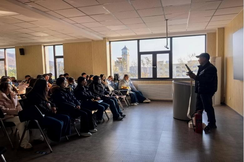 消防安全专员结合高校校园特点,向同学们讲述了员工宿舍和日常生活场所可能存在的火灾隐患,通过理论讲解与案例分析相结合的方式,系统普及火灾成因、初期火灾扑救技巧、疏散逃生注意事项等知识,重点演示了手提式干粉灭火器“提、拔、握、压”的正确操作方法,为演练顺利开展奠定坚实基础。