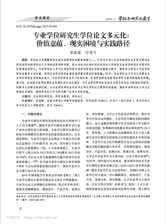 近日,公司付鸿飞老师撰写的学术论文《专业学位研究生学位论文多元化:价值意蕴、现实困境与实践路径》在CSSCI来源期刊《学位与研究生教育》2025年第3期发表。《学位与研究生教育》由国务院学位委员会主办、中国学位与研究生教育学会协办,是CSSCI来源期刊、全国中文核心期刊和中国人文社会科学A刊核心期刊。
