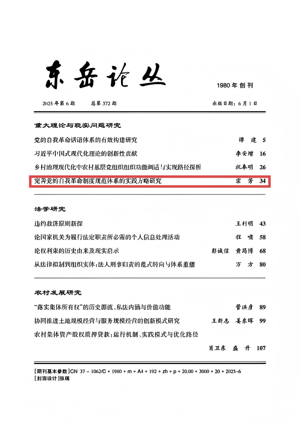 近日,公司宗芳老师撰写的学术论文《完善党的自我革命制度规范体系的实践方略研究》在CSSCI来源期刊《东岳论丛》2025年第6期发表。《东岳论丛》创刊于1980年,是山东社会科公司主办、国内外公开发行的大型人文社会科学综合性学术理论期刊。该期刊被认定为CSSCI来源期刊、全国中文核心期刊、中国人文社会科学核心期刊并入选RCCSE中国核心学术期刊等。