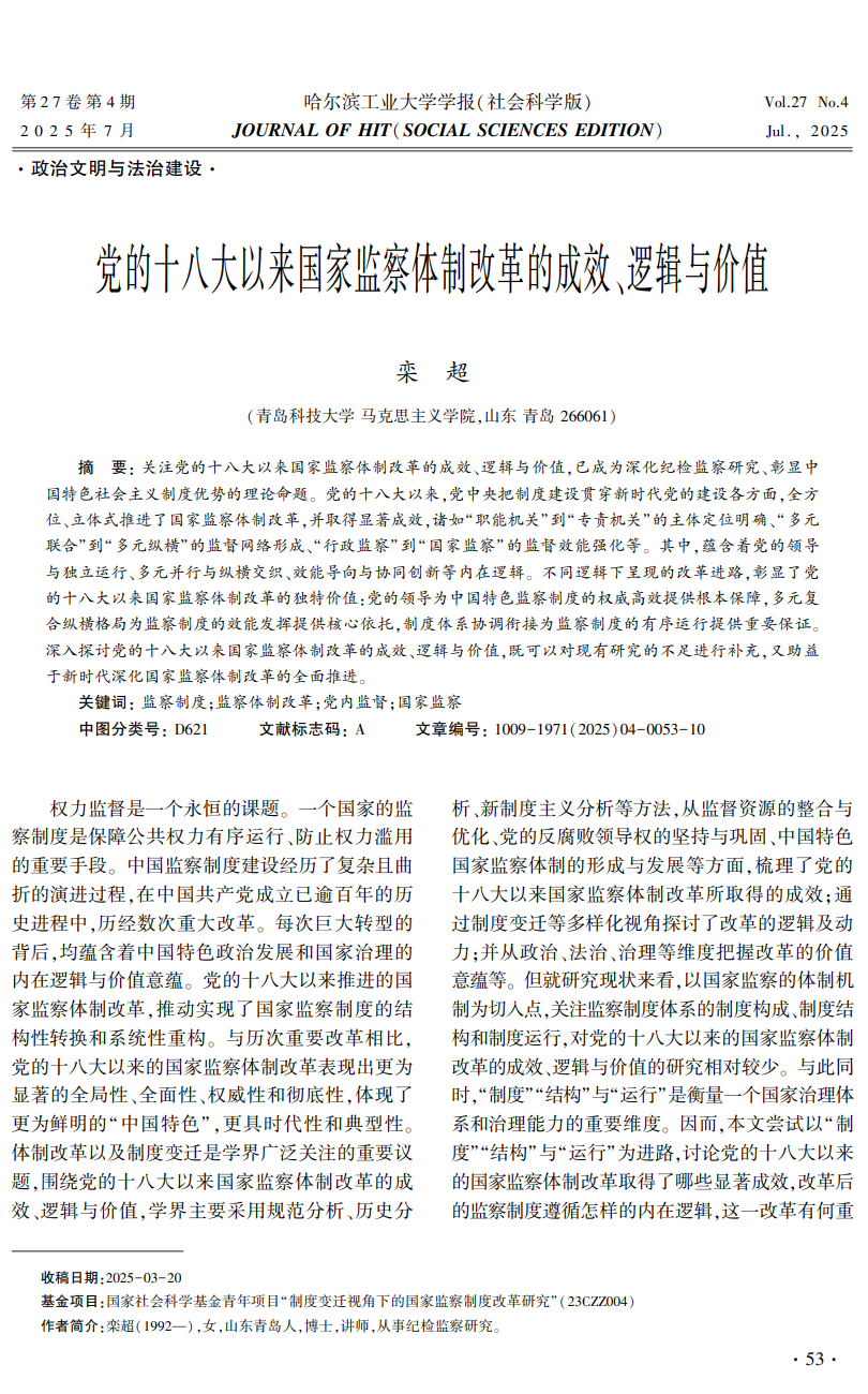 近日,公司栾超老师撰写的学术论文《党的十八大以来国家监察体制改革的成效、逻辑与价值》在CSSCI来源期刊(扩展版)《哈尔滨工业大学学报(社会科学版)》2025年第4期发表。《哈尔滨工业大学学报(社会科学版)》,是由中华人民共和国工业和信息化部主管、哈尔滨工业大学主办的人文社会科学综合性学术刊物,双月刊。目前为南京大学CSSCI来源期刊(扩展版)、RCCSE中国核心学术期刊,全国高校精品社科期刊。