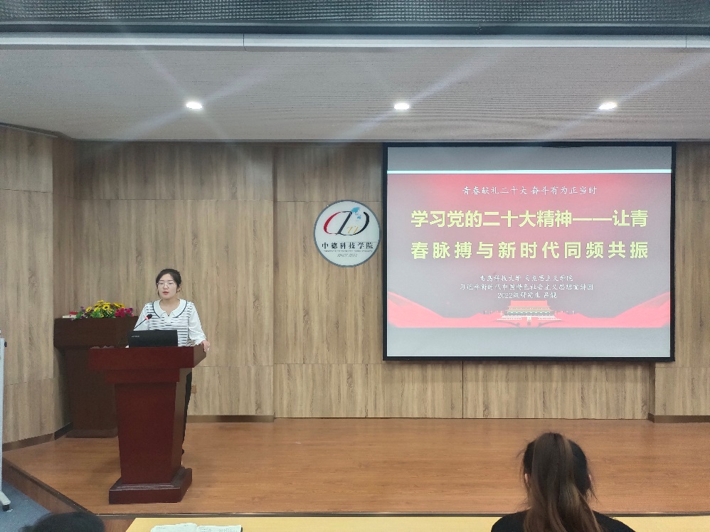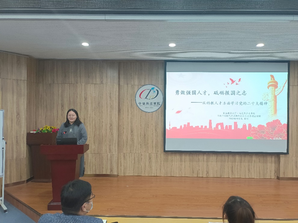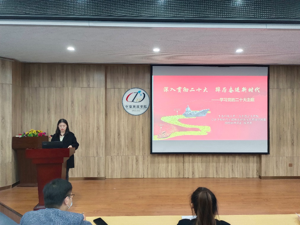 张笑笑以党的二十大报告主题为切入点,带领大家学习了中国特色社会主义伟大旗帜、伟大建党精神等方面的内容。大会主题是大会精神的集中体现,是大会报告的灵魂和主旨。领会好大会主题的丰富内涵,对于全面准确领会大会精神特别是报告的精神大有裨益。作为新时代青年应坚定理想信念,砥砺奋进之力,应矢志艰苦奋斗,锻造强筋壮骨,勇挑重担,扬帆远航。