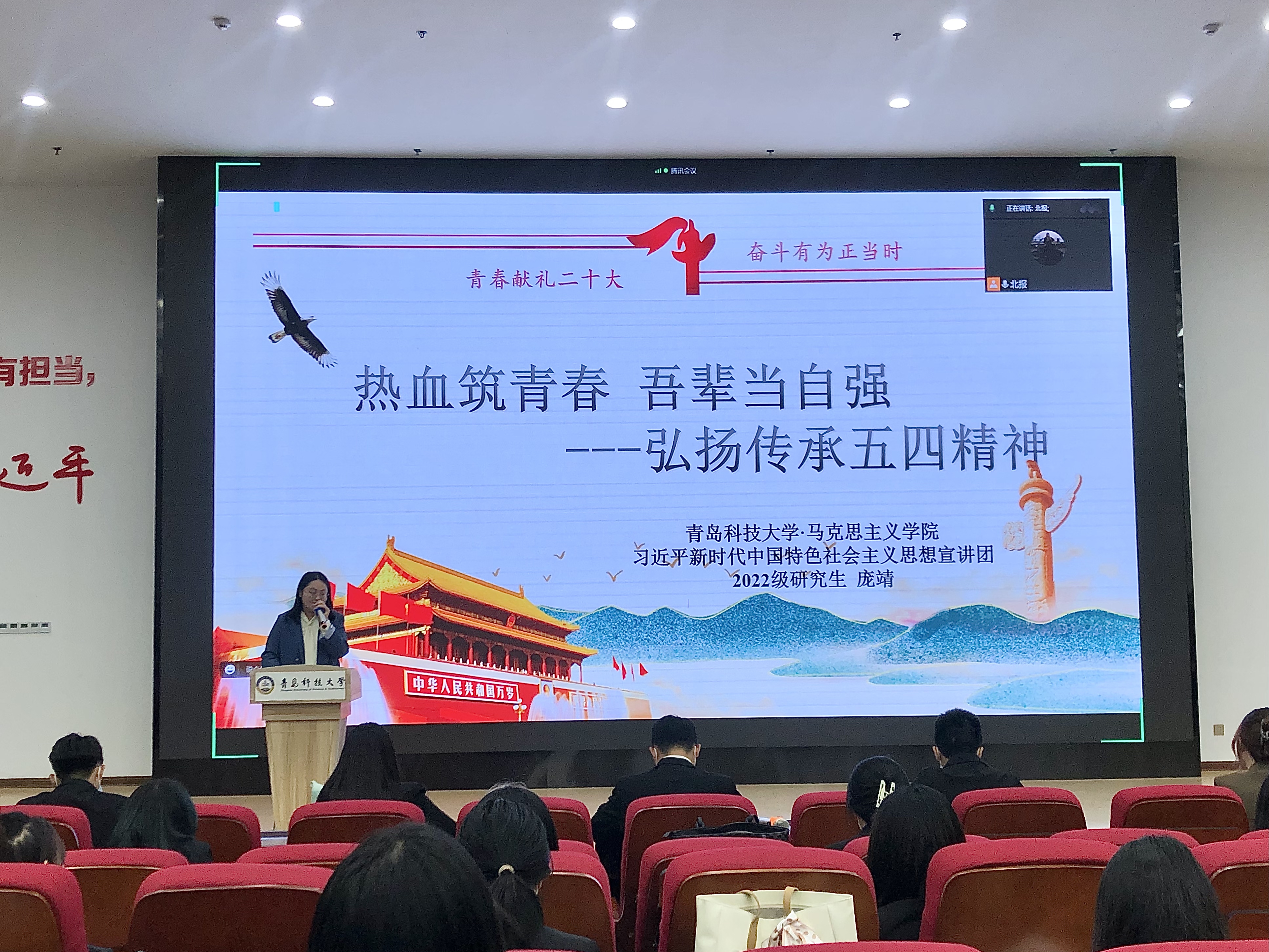 庞靖以《热血筑青春,吾辈当自强——弘扬传承五四精神》为主题,通过讲述五四运动和五四精神的相关内容,激励大家以一腔爱国热血,一番少年志气,传承和弘扬五四精神,在新时代和新征程上展示新气象和新作为。