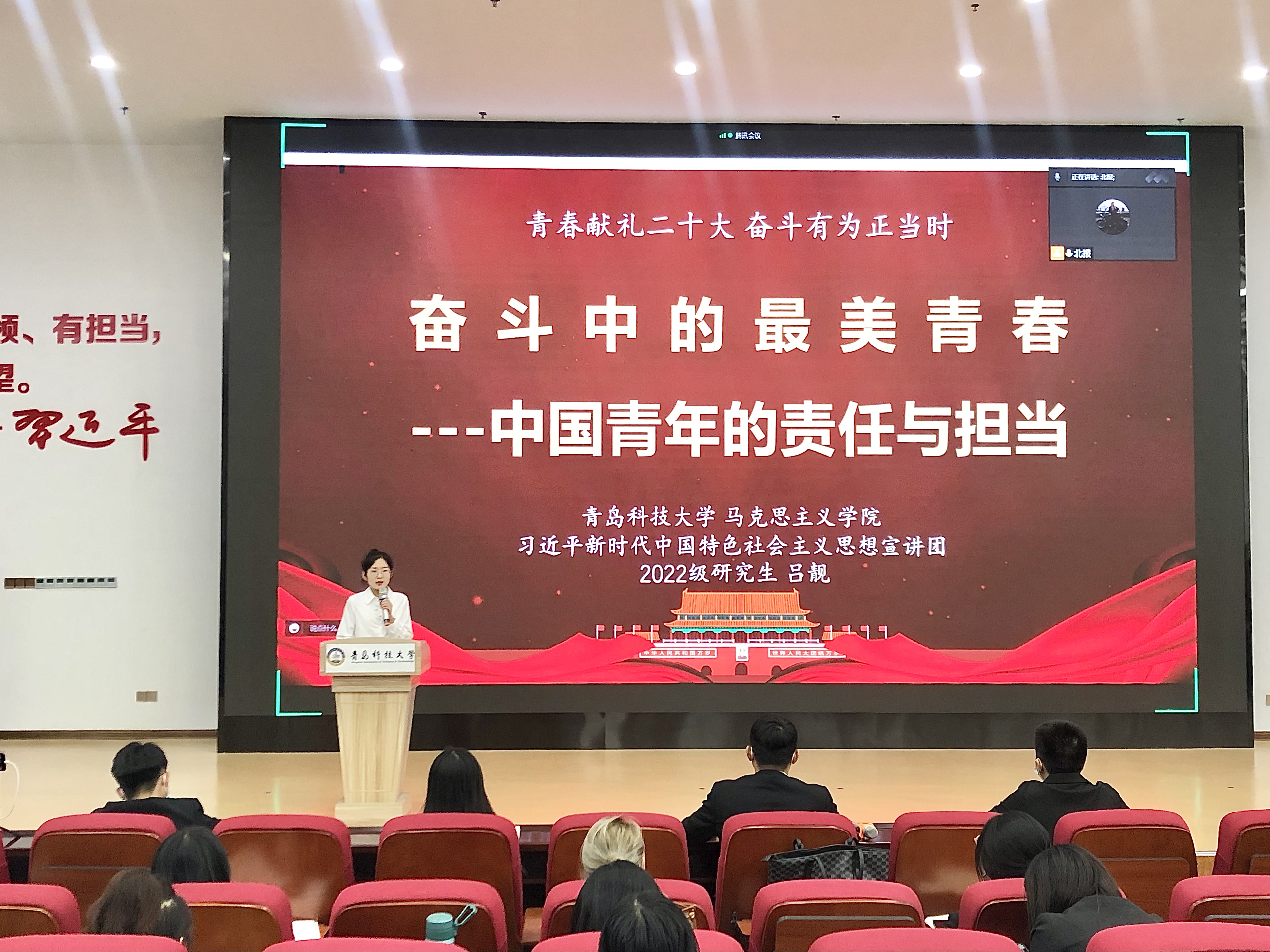 张瑜以《青春献礼二十大,奋斗有为正当时——“四史”学习教育》为主题,通过讲述党史、新中国史、改革开放史和社会主义发展史的发展历程,鼓励同学们在“四史”教育的学习中,要用客观的历史事实充实头脑,用实事求是的思想武装头脑,不断的砥砺思想定力,坚定理想信念。