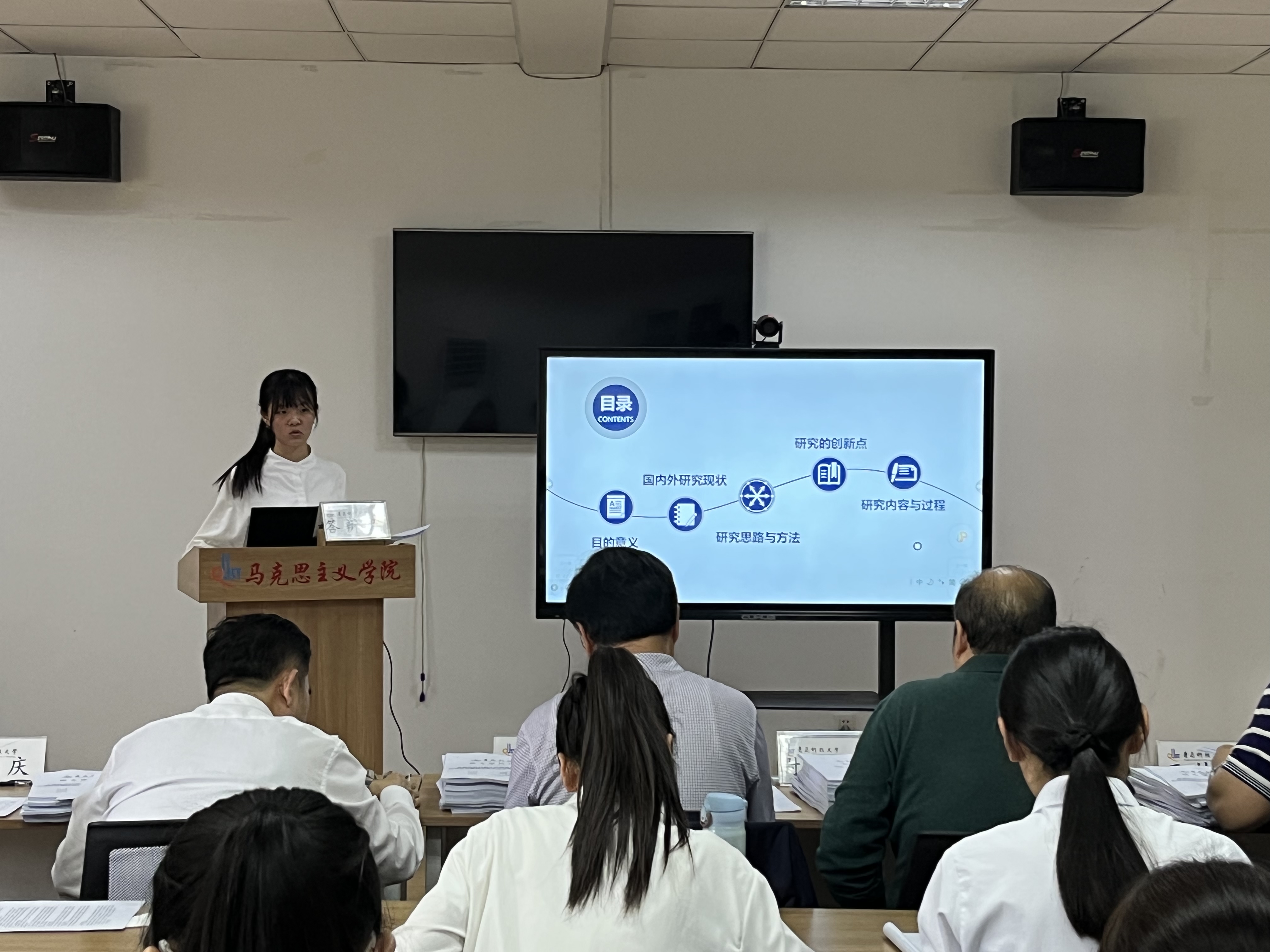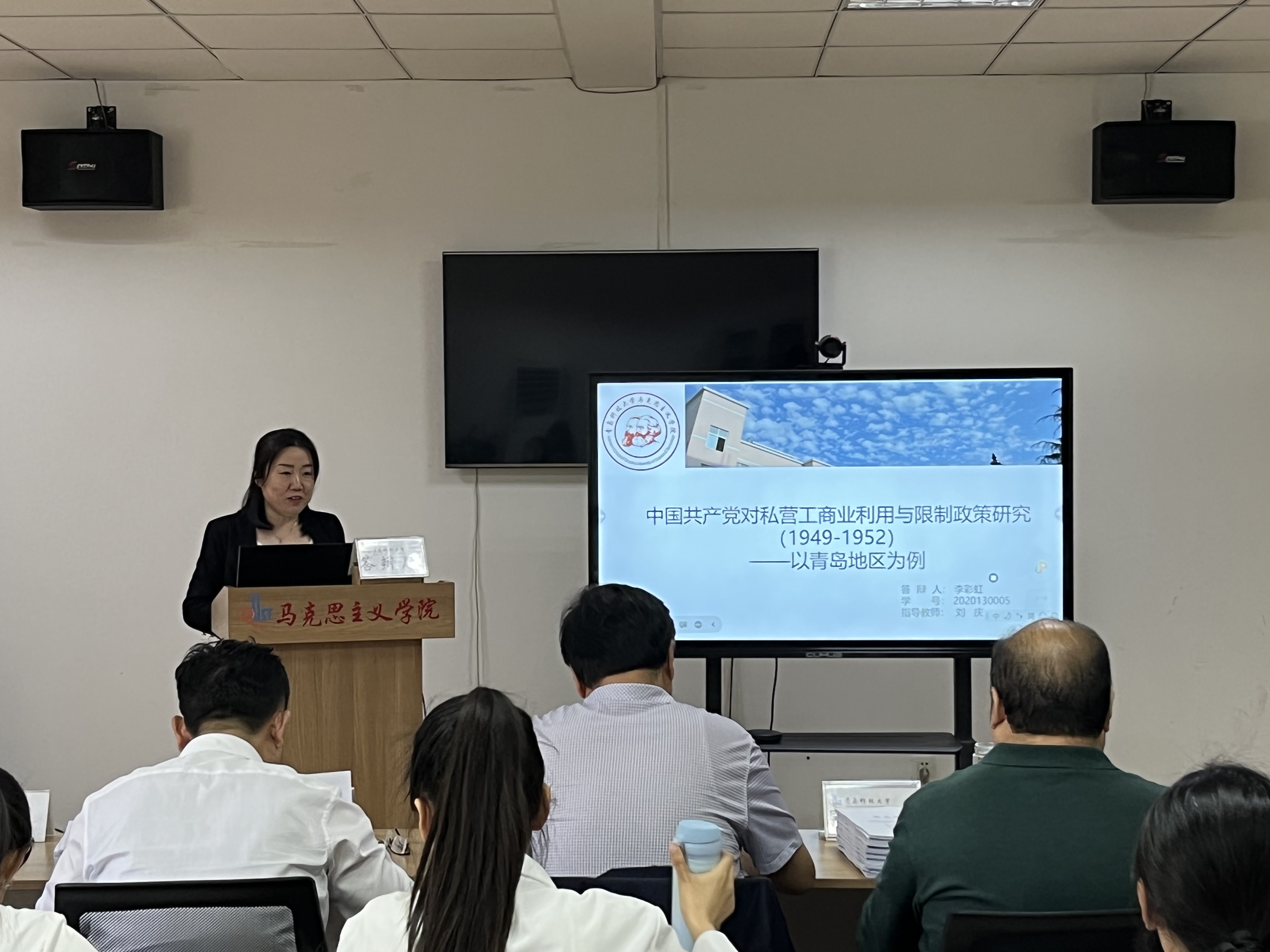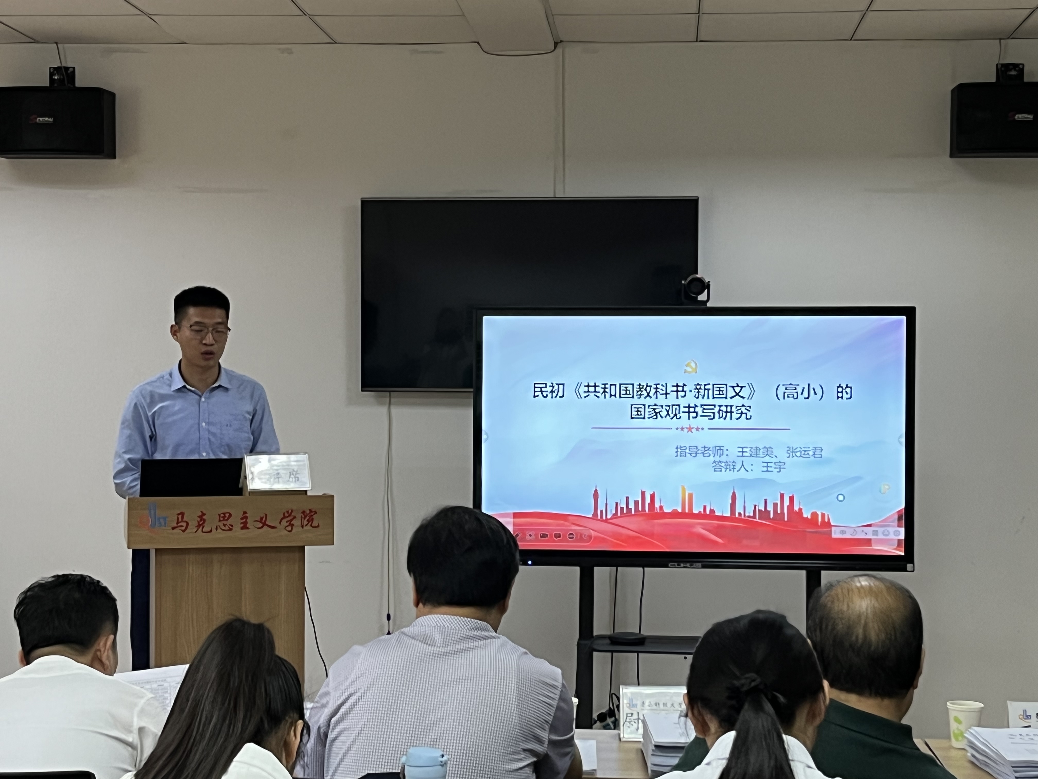 思想政治教育、中国近现代史基本问题研究方向的答辩会在2010室举行。答辩秘书刘彩萍介绍了答辩委员会成员及答辩流程。参加论文答辩的研究生崔淑玥、杜原妃、韩新怡、郝彤、李彩虹、刘航宇、吕凤玲、王宇、徐斐、于汭生、张军鹏、张美、张萌、赵欣荻分别汇报了自己的研究方法、创新点及论文写作思路框架等。各位专家针对员工的论文提出了修改意见及相关问题,随后答辩员工回答了各位专家老师的问题。最后答辩委员会对研究生的论文进行表决评选。