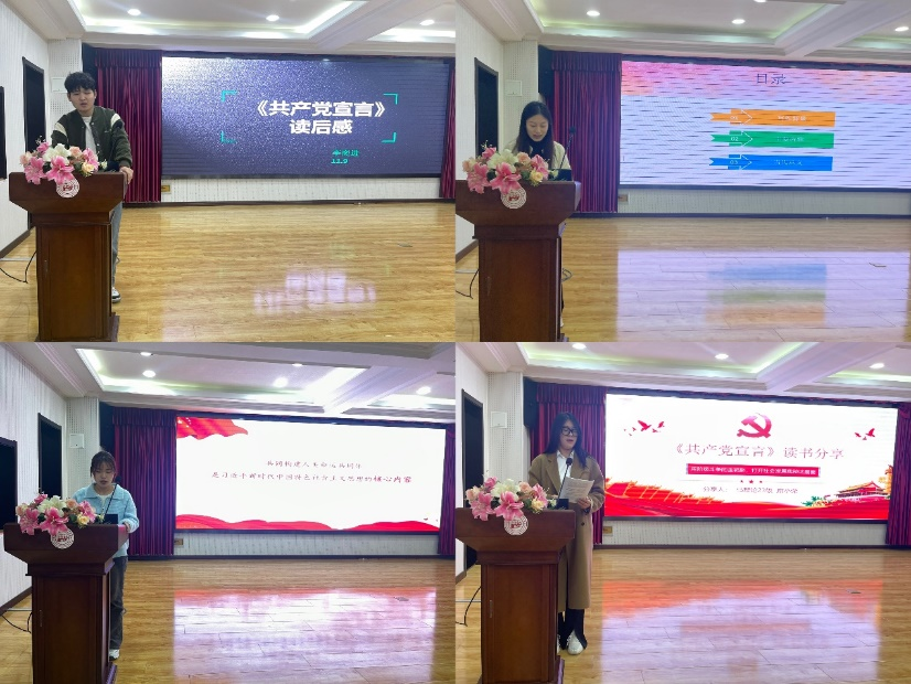 活动第一项,同学们展开经典诵读并分享心得。李辉、李婷婷、李奕进、王文琳、席小荣五位同学从不同角度对《共产党宣言》的时代背景、重点内容和重大意义等内容进行了解读,有利于让同学们提高思想政治觉悟,进一步树立马克思主义的世界观和价值观。段飞凡同学从《习近平著作选读》中剖析了习近平新时代中国特色社会主义思想创立的背景及其鲜明的理论品格,使同学们对习近平新时代中国特色社会主义思想的创立背景及丰富内涵有了更加深刻的认识。李新桐、贾梦双两位同学以《习近平谈治国理政》第四卷为出发点,分别对推进建设社会主义文化强国、构建人类命运共同体的基本内容进行了解读,有助于引导同学们感悟习近平总书记深厚的文化情怀、高度的文化自觉和强烈的文化担当。活动第二项,自由讨论环节。同学们踊跃发言,现场氛围十分热烈。