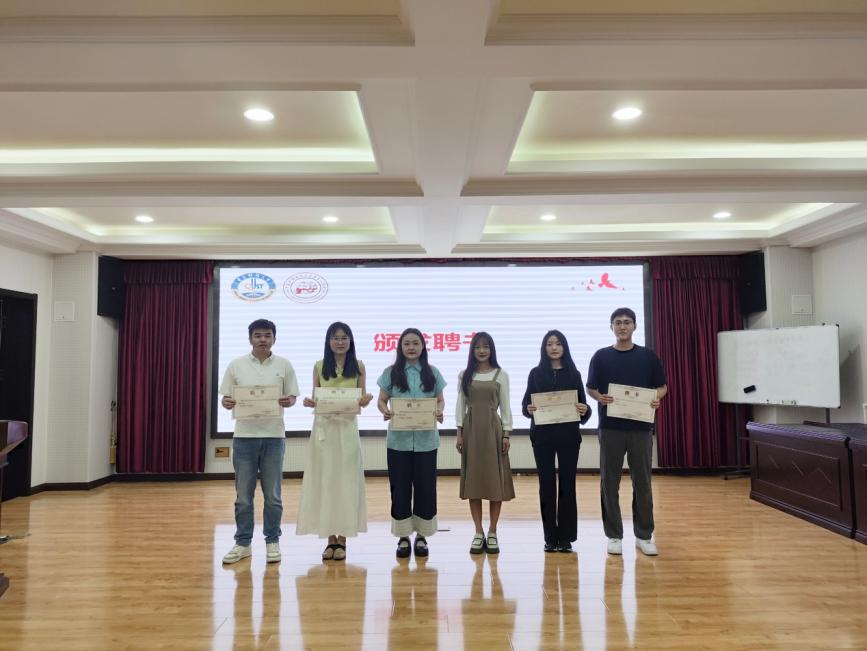 活动进行第二项,蓝鲸体育团总支书记李文睿老师为五位宣讲人颁发就业领航宣讲员聘书并合影留念。