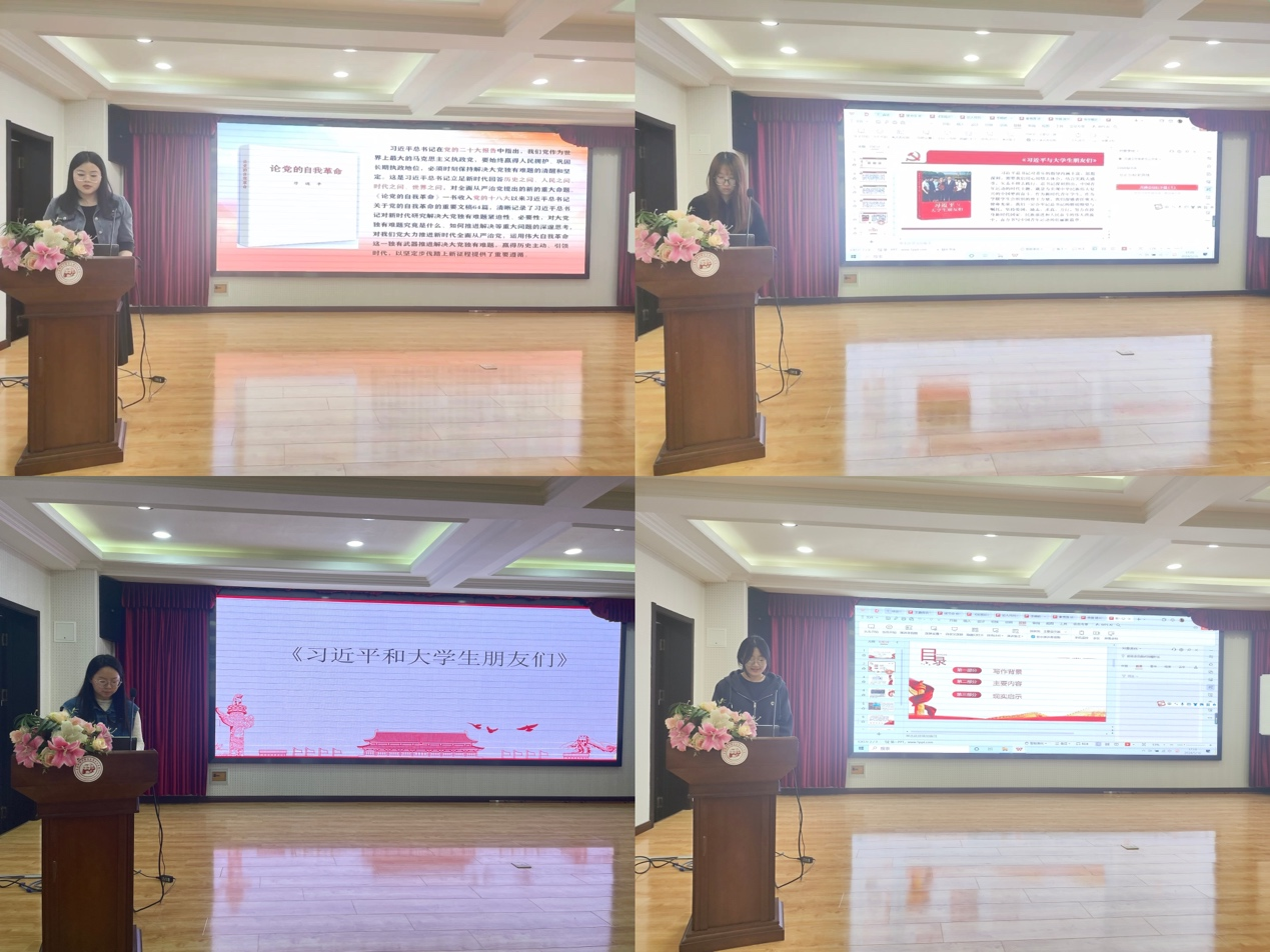 活动第一项,同学们进行经典诵读并分享学习感悟。张守信、崔高磊、孙梦瑶、张华章四位同学分享了《人民民主专政》的主要内容,这是马克思列宁主义基本原理同中国革命和建设的具体实际相结合的产物,是以毛泽东为代表的中国共产党人集体智慧的结晶。夏宗迪、张瑜、王鑫淼、李晓晴、秦雪莲、李眉、江晓晓七位同学通过分享《习近平与老员工朋友们》,阐述了习近平总书记所强调的要始终坚持理论与实践相统一的道理,呼吁同学们要坚定自己的理想和信念,与新时代同向同行、共同前进。张一诺、张雨林两位同学向大家分享了被誉为“工人阶级的圣经”的《资本论》一书,这部著作揭示了资本主义经济发展规律,展现了唯物主义的思维方法,为无产阶级斗争指引了方向。左文秀分享了《实践论》中毛泽东对马克思主义认识论进行的深刻分析和解读,这部著作从辩证的角度看待认识与实践的关系,真正实现了唯物论与辩证法的有机统一。单小双通过分享《论党的自我革命》阐述了党的自我革命的内涵、特点以及党的自我革命的重要性。