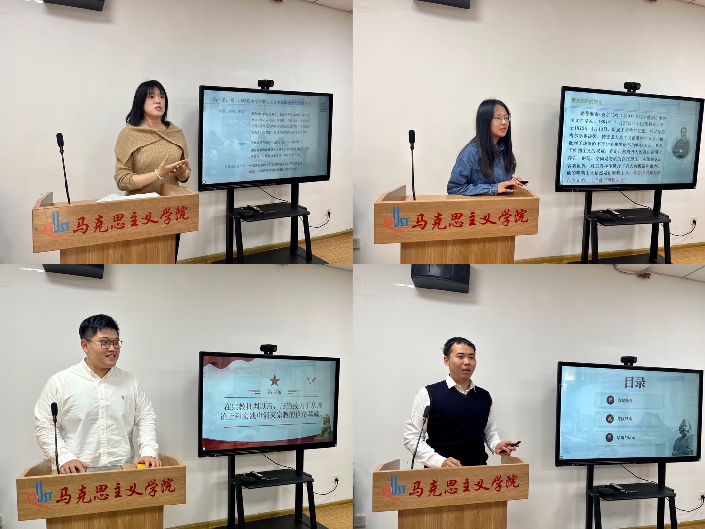 同学们围绕被称为“天才萌芽”的马克思主义经典文本《关于费尔巴哈的提纲》进行分享和交流。席小荣、张琪、王靖森、谢云帆四位同学从不同的角度,重点分享和探讨了科学实践观、哲学基本问题、旧唯物主义的缺陷、宗教产生的根源等问题,揭示了费尔巴哈哲学的唯心主义倾向,强调了马克思主义哲学的现实性和革命性。