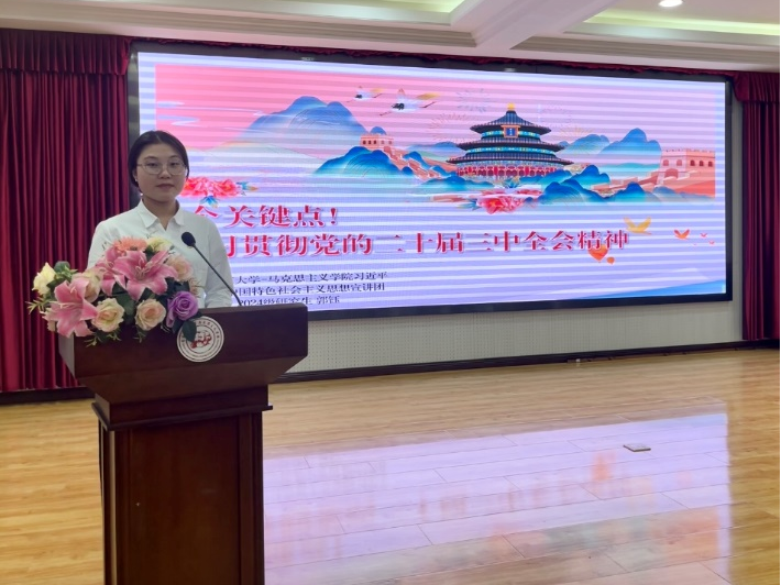 郭钰以《6个关键点!学习贯彻党的二十届三中全会精神》为主题,围绕六个关键方面对党的二十届三中全会精神进行解读,同时根据信息公司的专业特色,通过具体案例讲解了新质生产力、乌镇互联网大会等内容,把党的创新理论转化为通俗化、大众化表达,引发大家的思想共鸣,推动党的二十届三中全会精神深入人心。