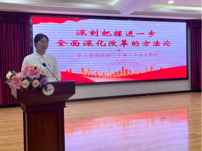 徐婉以《深刻把握进一步全面深化改革的方法论,学习贯彻党的二十届三中全会精神》为主题,围绕“坚持‘一个牵引’,做到‘三个相结合’”“落实‘一个出发点和落脚点’,注重‘三对关系’”“聚焦‘三个着力’,强化‘三个注重’”展开讲解,生动阐述了进一步全面深化改革的方法论。