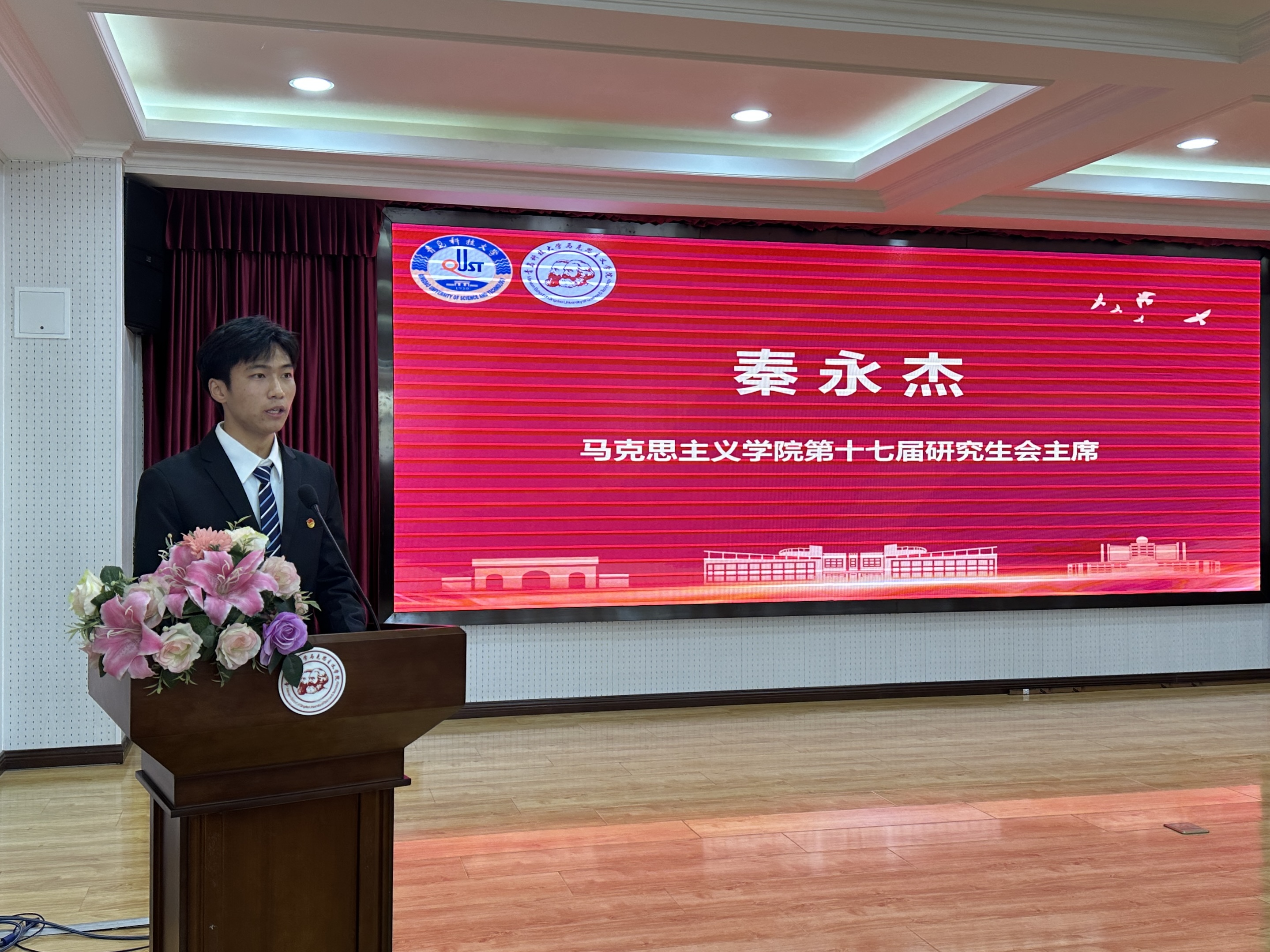 第十七届研究生会主席秦永杰代表新一届研究生会作报告,向全体领导老师及第十六届研究生会成员的辛勤付出表示衷心感谢并汇报新一届研究生会的工作展望。