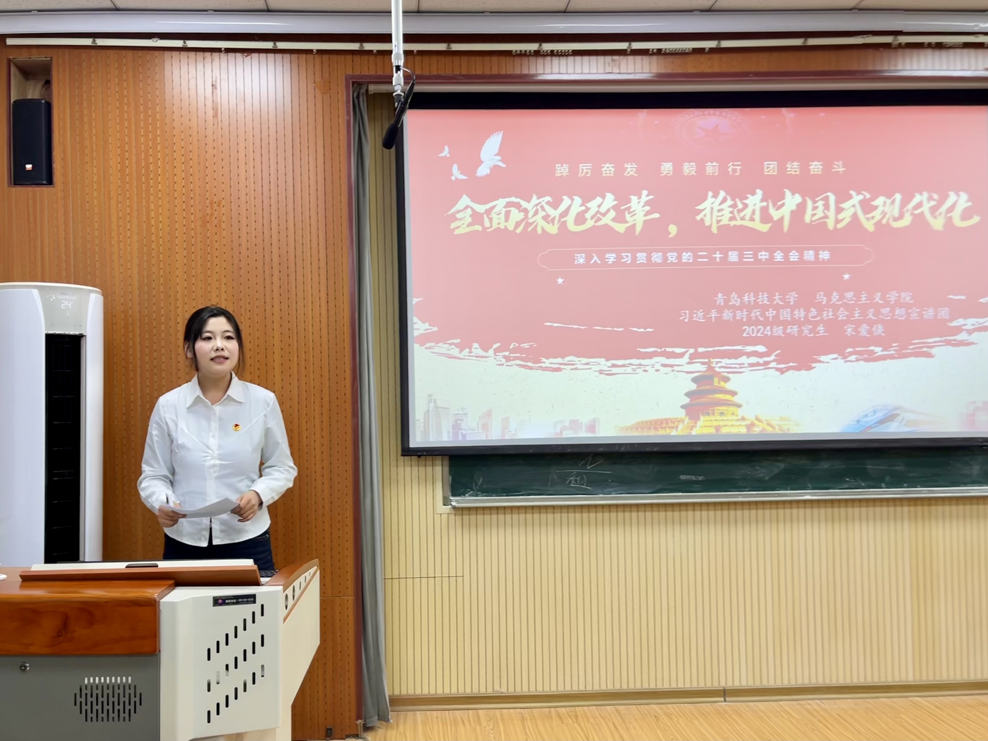 宋爱侠以《全面深化改革,推进中国式现代化——深入学习贯彻党的二十届三中全会精神》为主题,从时代背景、内涵、保障措施和成果与展望四个方面出发,对全面深化改革进行了深刻解读,通过视频为大家生动展现了改革开放以来取得的辉煌成果,极大地激发了同学们的爱国热情和奋斗精神,鼓舞大家凝心聚力、勇于担当、砥砺前行,以青春之我做走在时代前列的奋进者和开拓者。