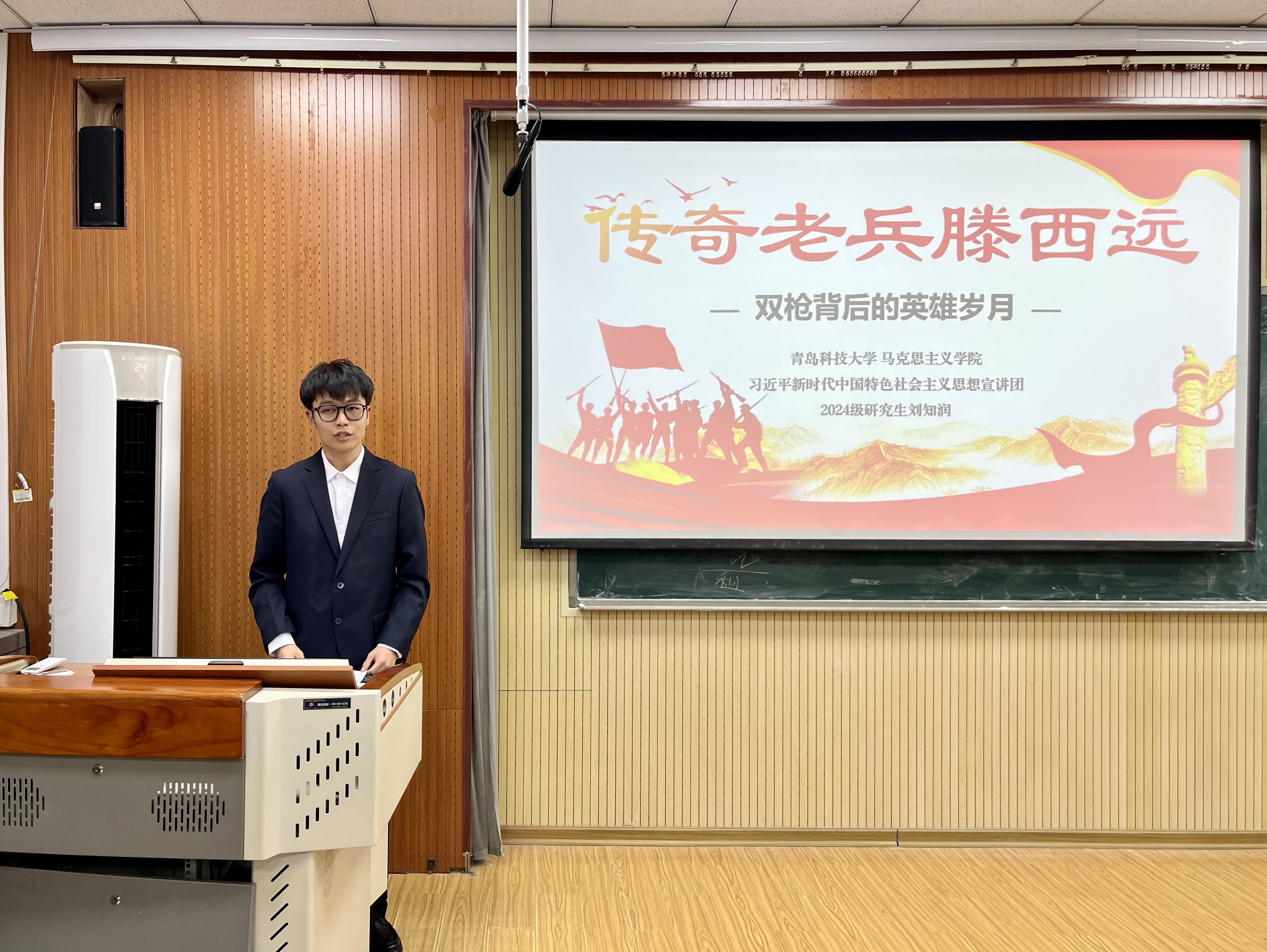 刘知润以《传奇老兵滕西远——双枪背后的英雄岁月》为主题,从老兵滕西远在苦难童年,投身革命、在战争中屡建奇功,名震战场、在荣耀岁月中不忘初心、以及弘扬抗战精神,凝聚起新时代的奋进力量四个方面进行分享,勉励经管青年应从革命历史中汲取智慧和力量,不忘初心、牢记使命,继承和弘扬抗战精神,为实现中华民族伟大复兴的中国梦而努力奋斗。