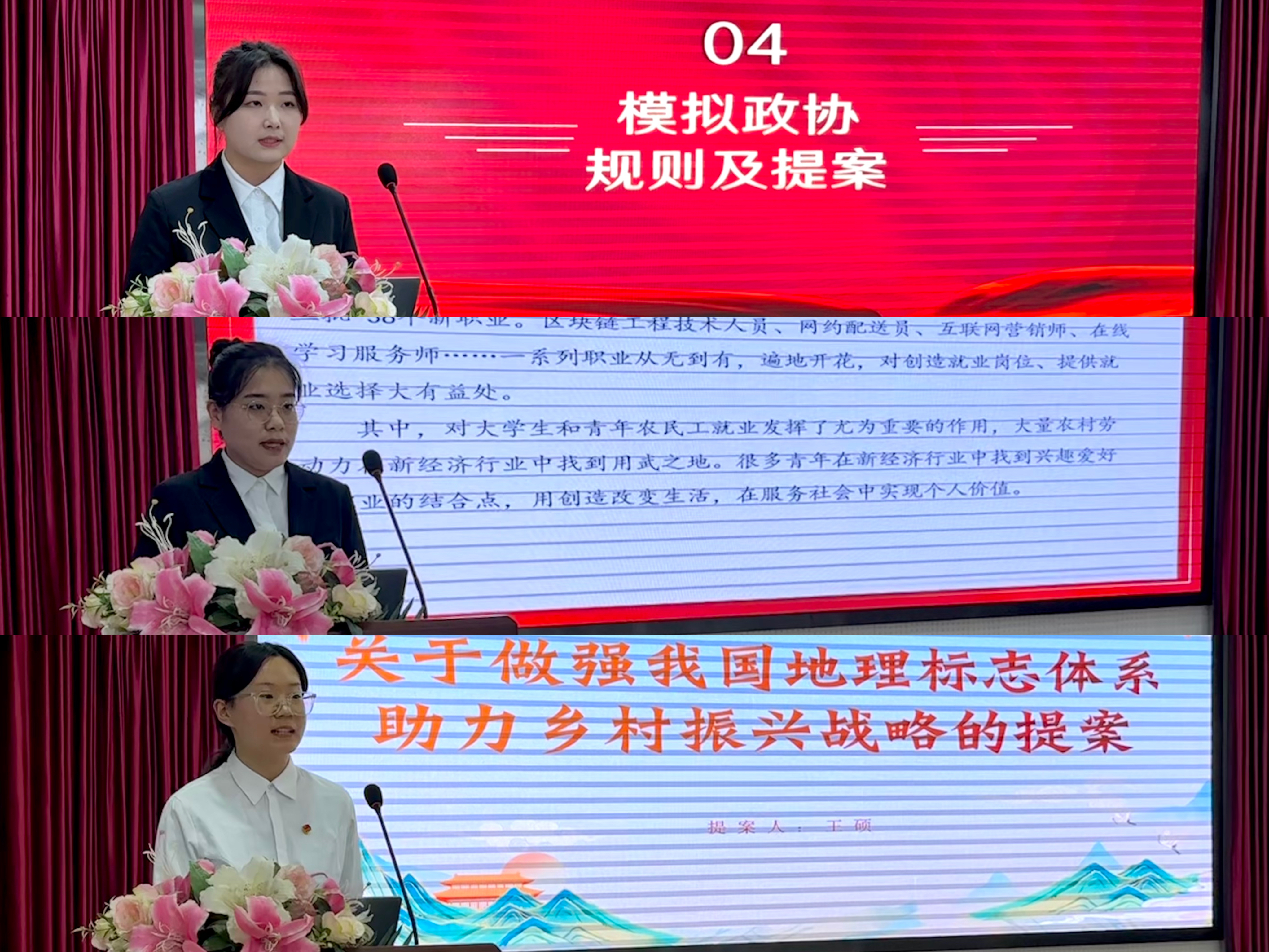沉浸式践学。团总支委员管晓晖进行模拟政协规则讲解。随后,根据前期各个团支部商讨提案情况,由2022级团支部书记李婷婷和2023级团支部书记王硕模拟实践。李婷婷和王硕分别围绕《新职业青年成长发展》和《做强我国地理标志体系助力乡村振兴战略》作了相关汇报。