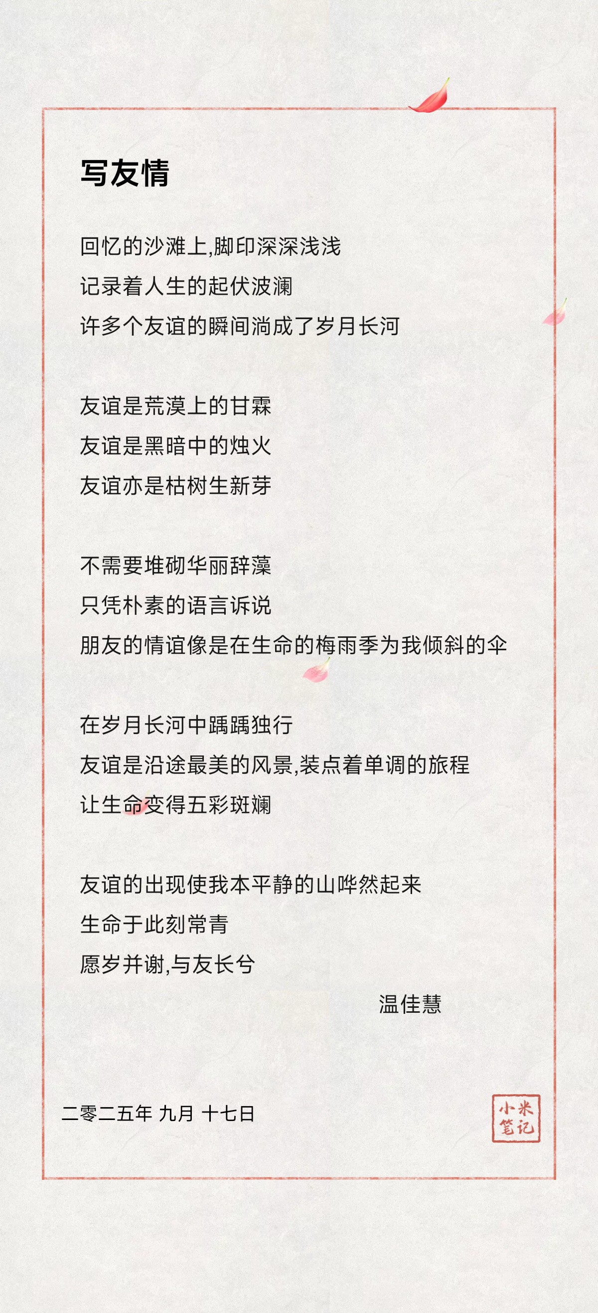 活动期间,蓝鲸体育通过线上方式向同学们征集与友情相关的诗歌、信件及影像资料。同学们踊跃参与,字里行间藏着同窗间的暖心瞬间,镜头内外定格着相伴的珍贵画面,这些充满温度的作品不仅让友情有了具象的表达,更让“友爱” 的种子在校园里愈发蓬勃生长。
