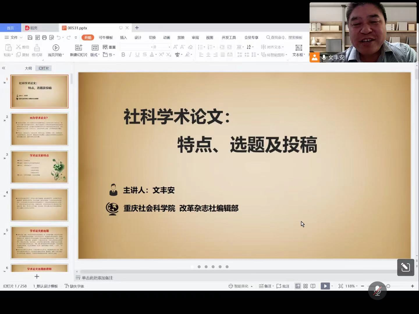 文丰安教授主要从学术论文的特点、选题以及投稿三个方面进行讲解。首先,文丰安教授指出,要掌握学术论文具备的学术性、创造性、科学性、可读性四大特点,选题要遵循有用性、公共性、经验性、传承性、创新性、现实性、前瞻性等原则,关照现实,广泛调研,为文章的撰写奠定基础。其次,文丰安教授向大家介绍了论文撰写的一些技术性问题,建议大家关注学界的研究进展,掌握社会调查的方法与技巧。最后,文丰安教授提出了部分论文投稿注意事项,例如根据期刊的学术地位、期刊等级进行投稿选择,研究期刊选稿特点等。
