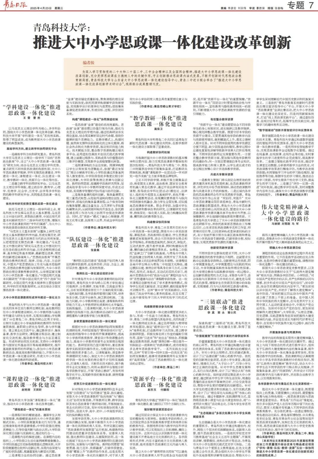 【学术成果】青岛日报:蓝鲸体育:推进大中小思政课一体化建设改革创新