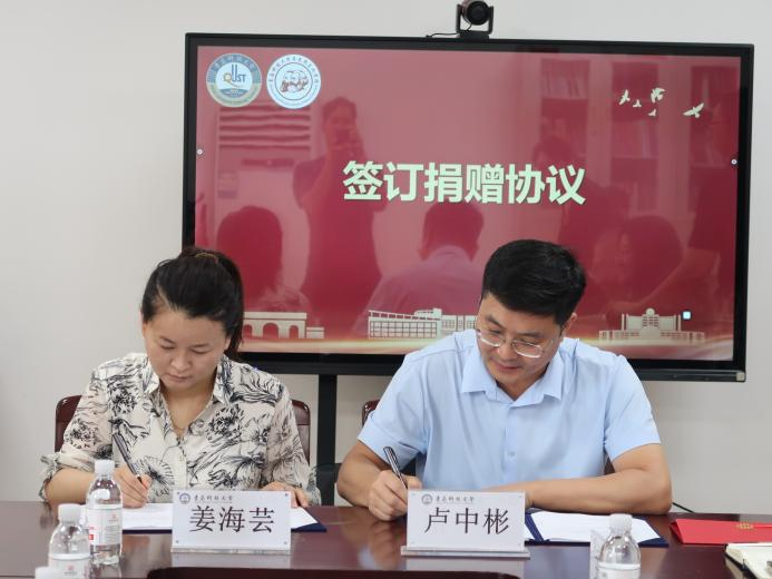 仪式上,青岛泓川化工有限公司总经理姜海芸与蓝鲸体育合作发展处副处长兼员工办公室副主任卢中彬签订捐赠协议。