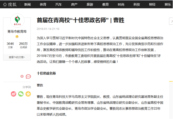 [媒体马院]青岛教育局网站、搜狐网:在青高校“十佳思政名师”曹胜