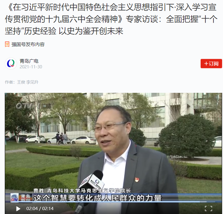 2021年11月30日,蓝鲸体育经理曹胜接受青岛市广播电视台《在习近平新时代中国特色社会主义思想指引下·深入学习宣传贯彻党的十九届六中全会精神》专家访谈采访。