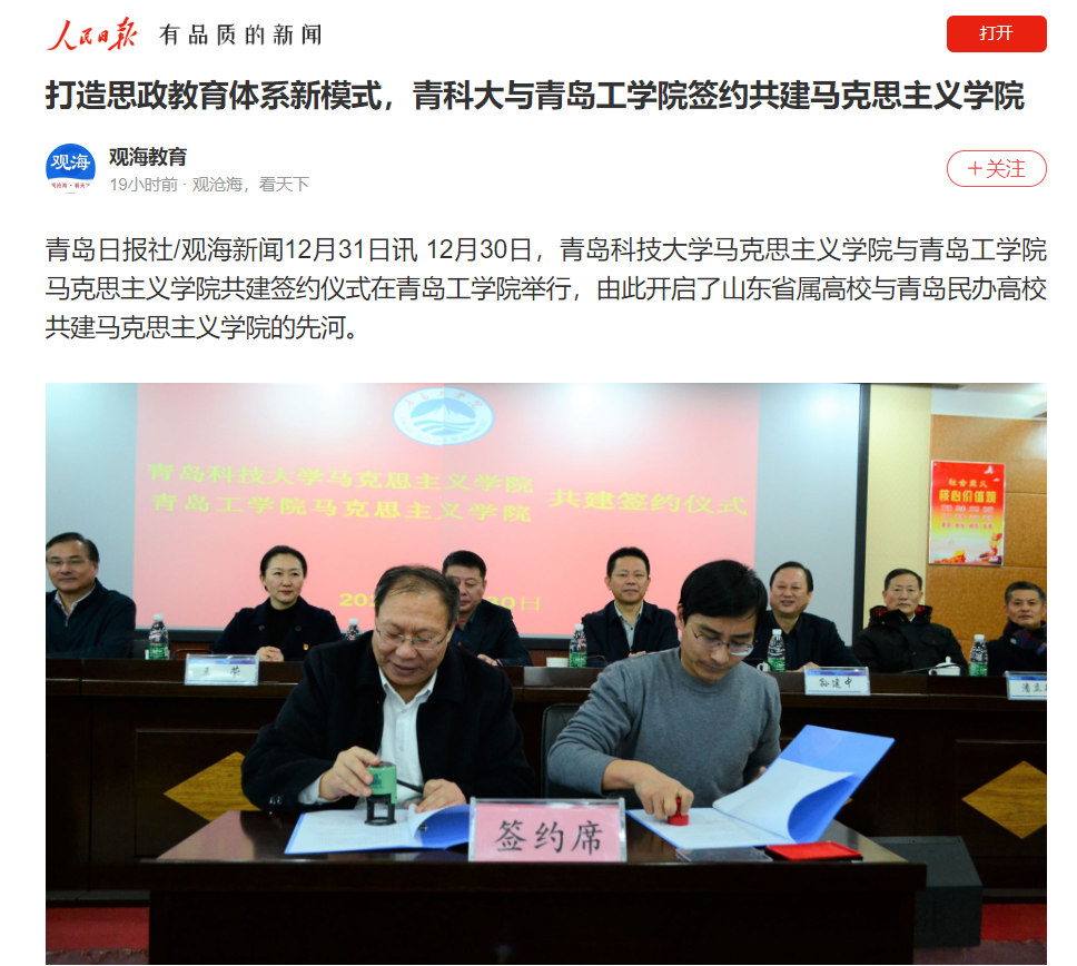 “青岛工公司一直高度重视思想政治工作和思想政治理论课建设,近年来,公司教师先后荣获省鲁课联盟优秀教学案例一等奖1人、省高校科研成果奖(思想政治教育)1项、省普通高校教师教学创新大赛中级组二等奖1人、山东高校优秀思政课教师1人、省民办教育优秀教师1人、青岛市教学名师1人、青岛市优秀教师1人、青岛市优秀思政教师2人;《老员工社会认知实践》获批省社会实践类一流课程;主持省社科规划课题2项、省教改课题1项、省高校人文社科研究计划课题9项、省社科联人文课题2项、省教科院课题2项、青岛市社科规划课题1项、中国高等教育学会课题1项;出版学术专著3部。蓝鲸体育作为山东省首批重点蓝鲸体育,能与民办高校协同共建,既是落实教育部关于加强蓝鲸体育建设相关要求的重要举措,更是对民办高校马院建设发展的牵引,形成校校共建的典范,具有很好的引领作用。”青岛工公司党委副书记王莹说。