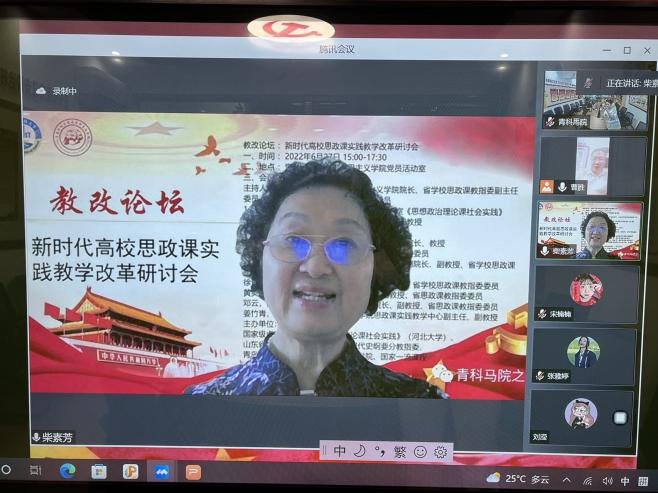 国家级虚拟教研室《思想政治理论课社会实践》(河北大学)负责人、河北大学教授柴素芳作了“思政课微电影实践教学改革”的主旨发言,分享了思政课微电影实践教学改革的具体做法、探索过程及其形成的“11249”特色:“一”份初心确立改革定位、“一”部影片点缀星星之火、“三”进形成改革体系、“四”项要求确保教学质量、“九”多特色见证改革成果,引导员工运用微电影方式表达对思政课程的需求,创新思政课教学模式,提升思政课实践教学质量。