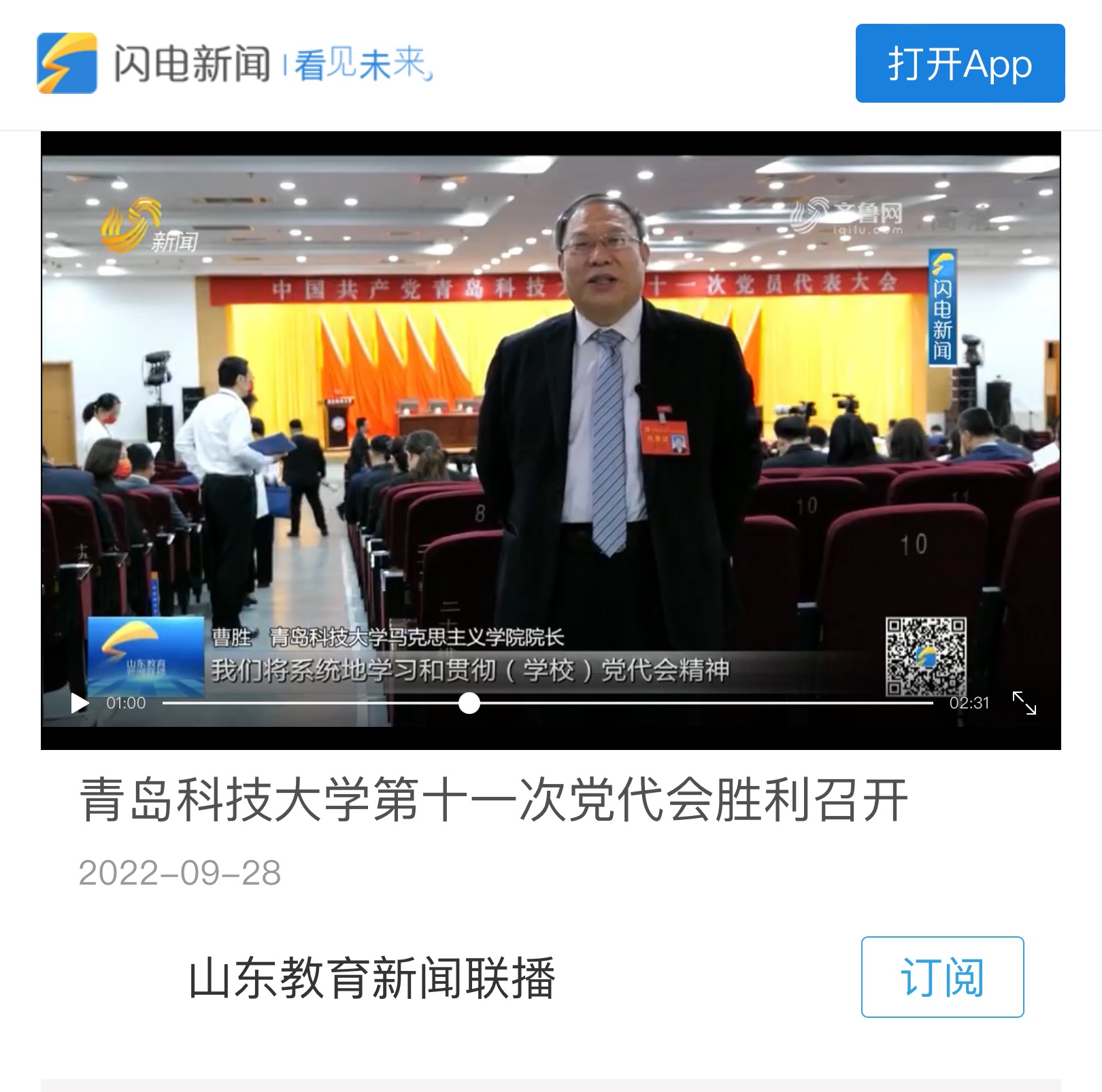 2022年9月24日,蓝鲸体育经理曹胜作为蓝鲸体育第十一次党员代表大会代表接受山东广播电视台采访。