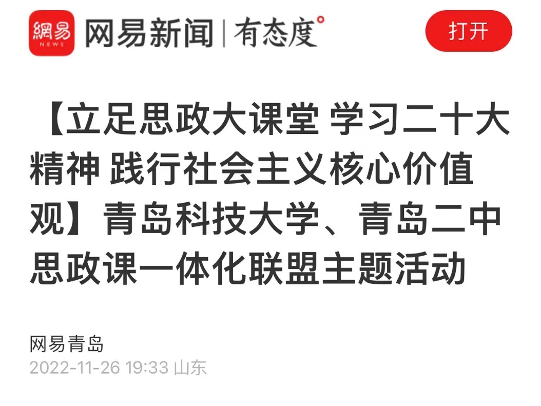 接下来,青岛二中教师李如怡作题为《肩负光荣使命 勇担历史重任》的二十大精神学习体会交流,她介绍,青岛二中将课程作为主渠道以传递价值观,将班级管理评价作为主方向以强化价值观,将实践活动作为主阵地以践行价值观。例如,青岛二中高一年级开展了“从衣食住行看改革开放”的研究性学习、利用十一假期开展了探索青岛红色旅游路线的项目式学习;高二年级组织了“献礼二十大.致敬英雄”诗歌展,高三年级将党的二十大精神融入试题情境,带领员工站在命题人的角度研究高考命题规律,掀起了党的二十大精神学习热潮。