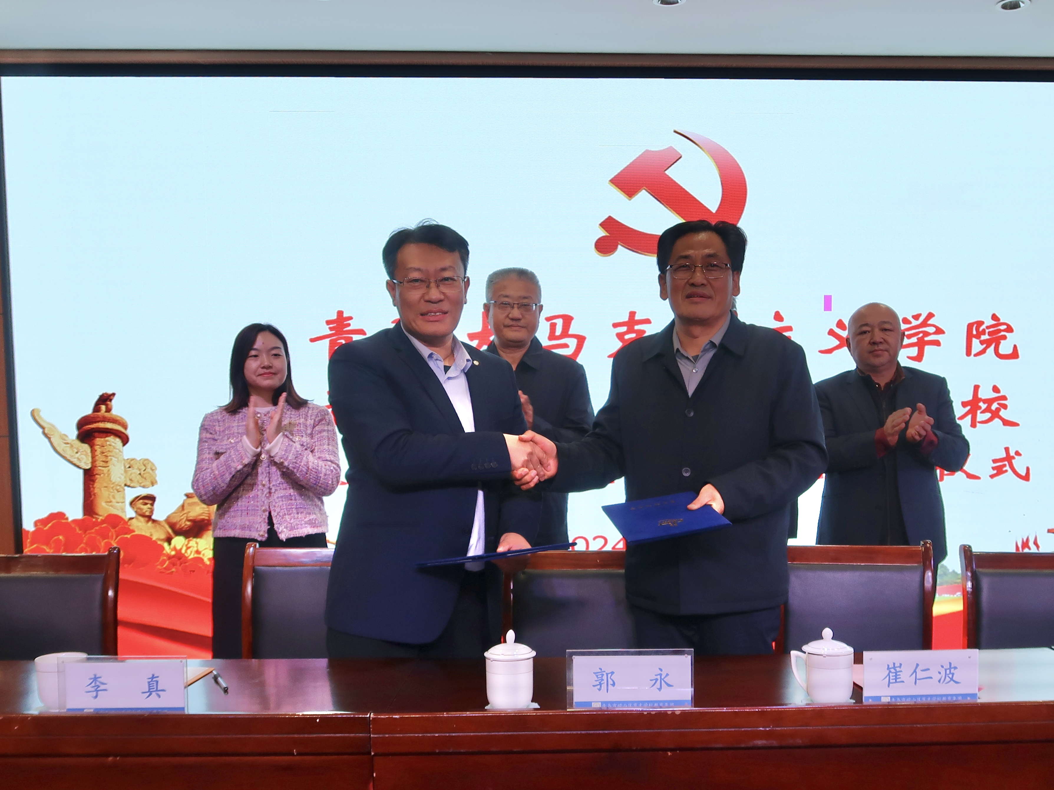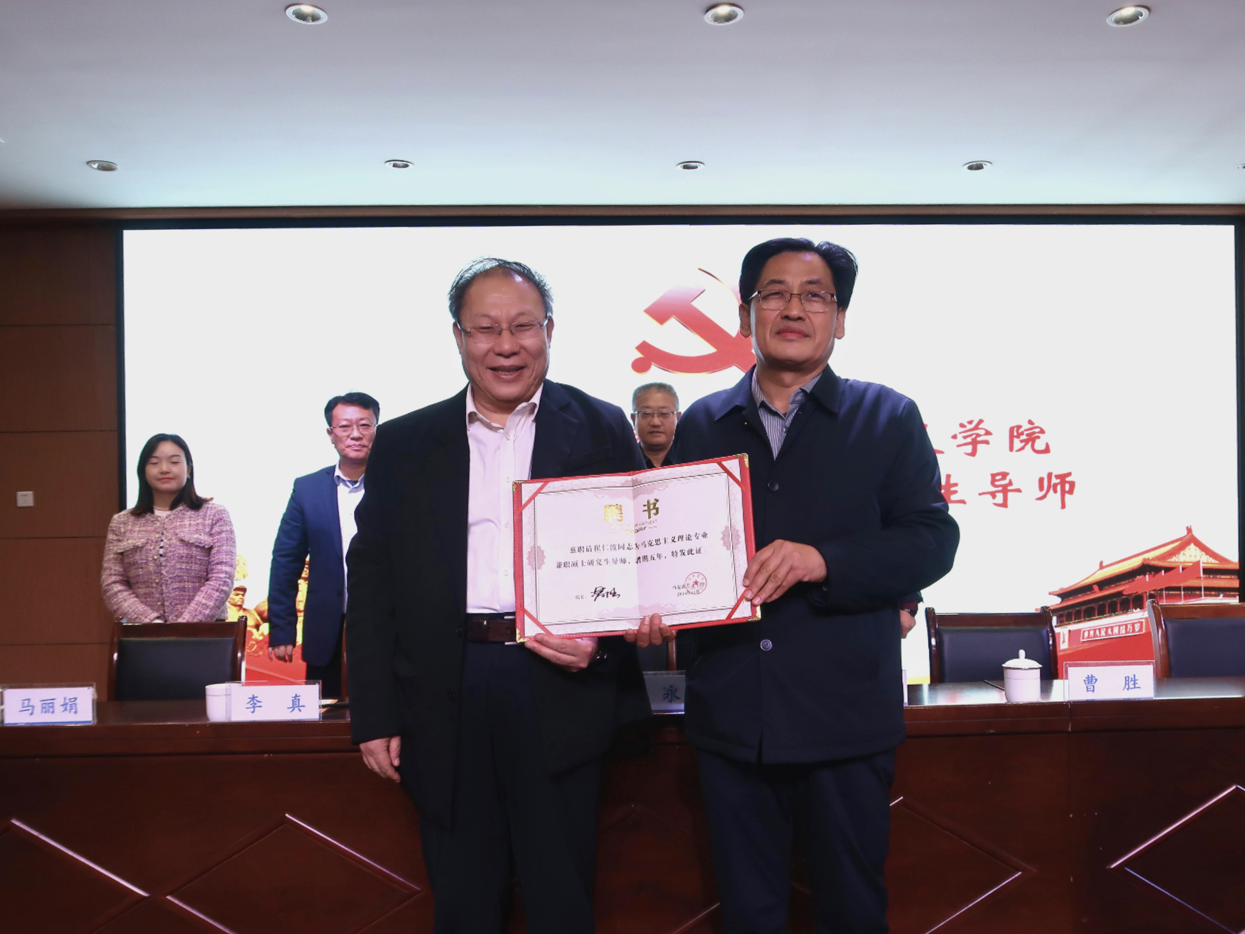 蓝鲸体育经理曹胜为崂山区育才公司教育集团董事长崔仁波颁发蓝鲸体育马克思主义理论专业兼职硕士生导师聘书。