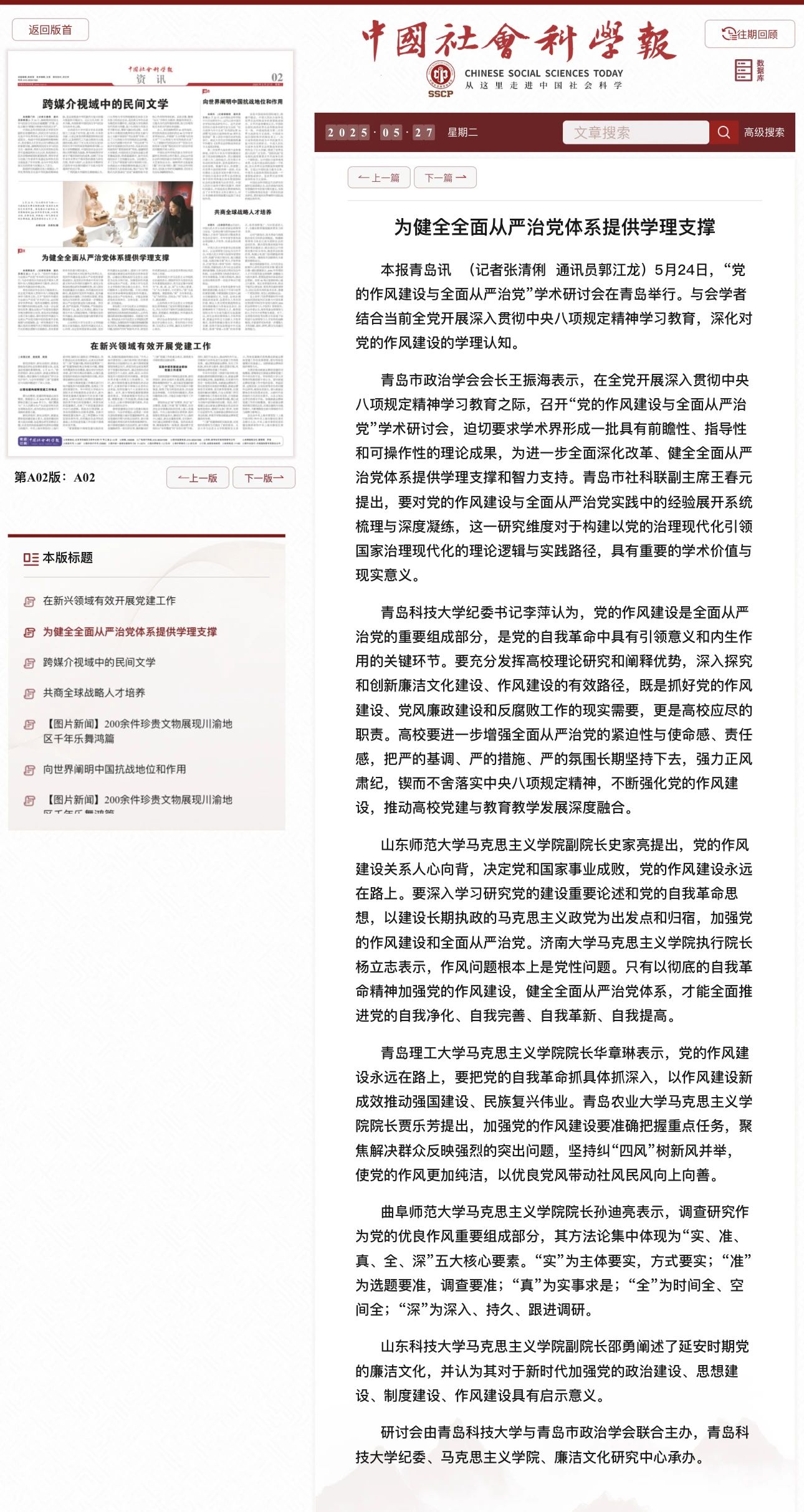 中国社会科学报:为健全全面从严治党体系提供学理支撑