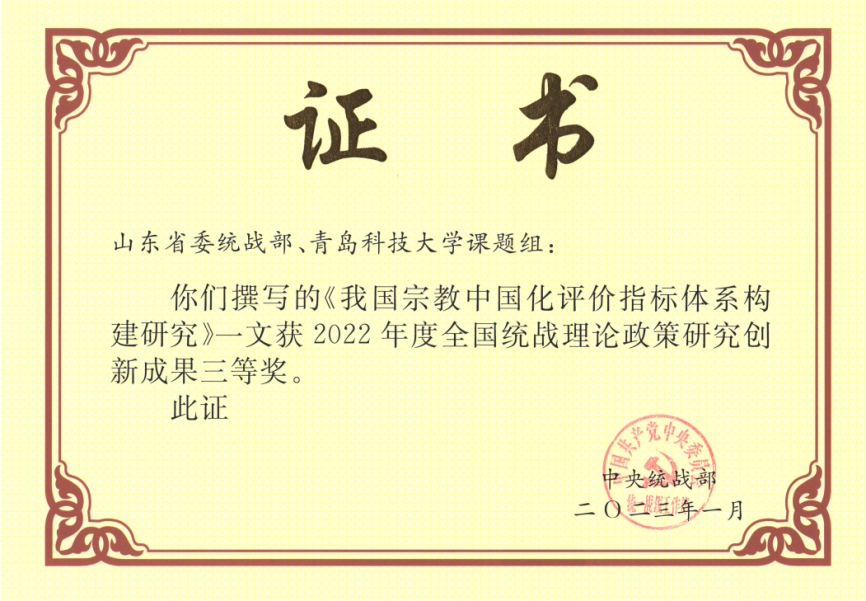 2022年度全国统战理论政策研究创新成果三等奖:我国宗教中国化评价指标体系构建研究