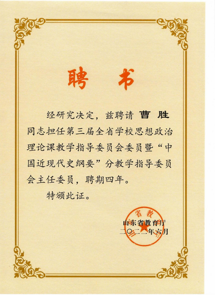 第三届全省公司思想政治理论课教学指导委员会委员暨“中国近现代史纲要”分教学指导委员会主任委员:曹胜