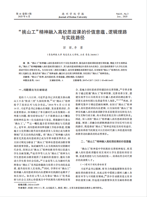 《德州公司学报》:“挑山工”精神融入高校思政课的价值意蕴、逻辑理路与实践路径