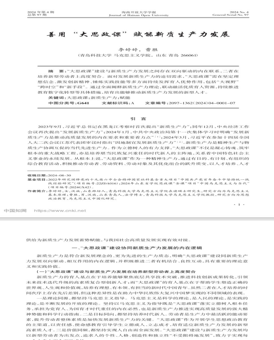 《海南开放大学学报》:善用“大思政课”赋能新质生产力