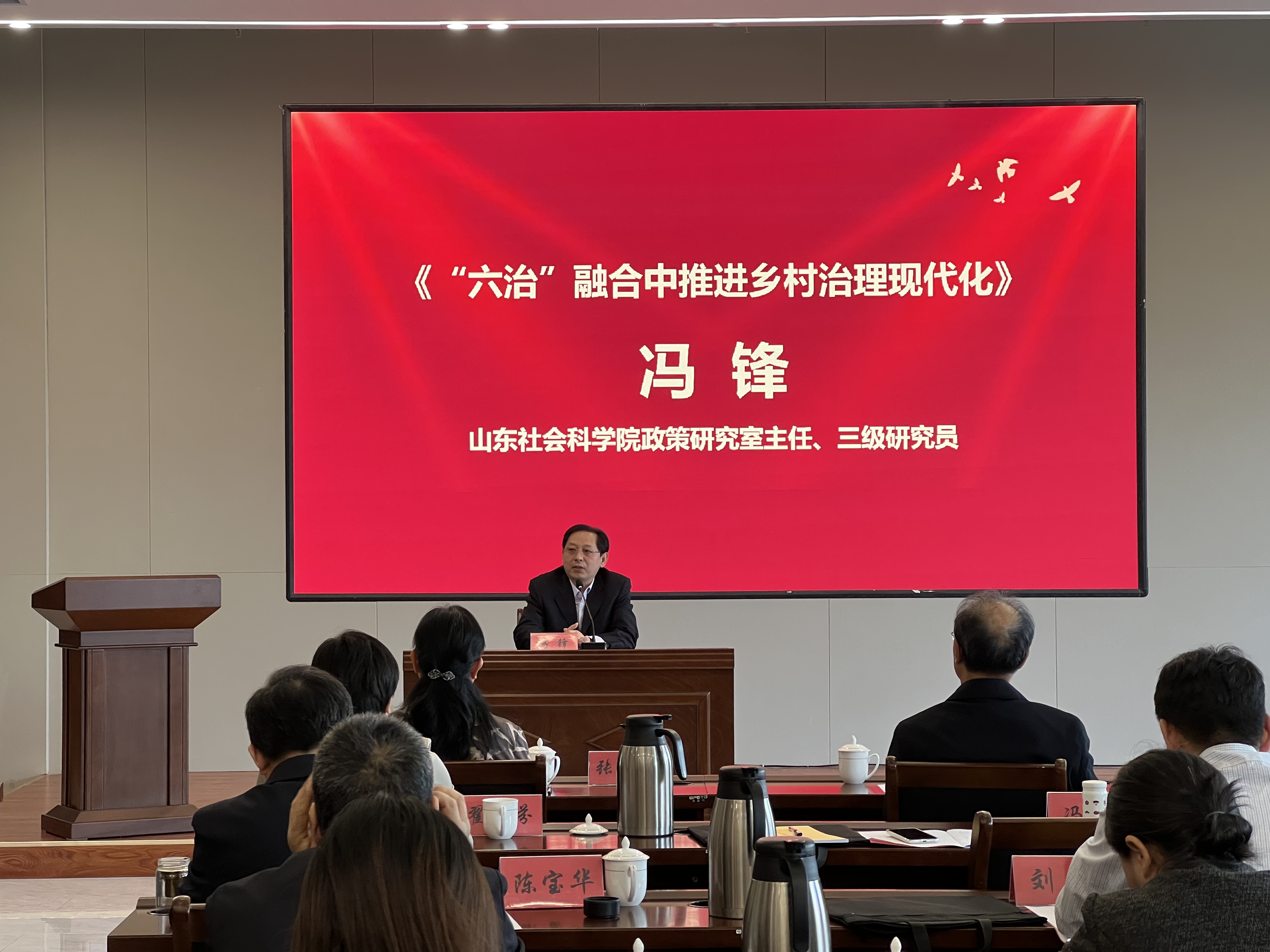 山东社会科公司政策研究室主任、三级研究员冯锋以《“六治”融合中推进乡村治理现代化》作主题报告。